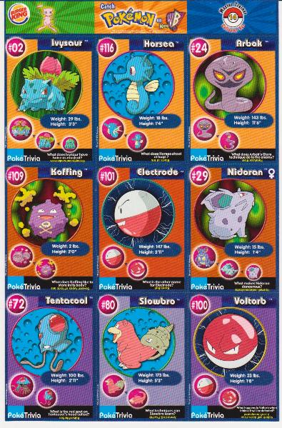 This is an original 1999 Burger King Pokemon Master Trainer Collector Set Uncut Sheet.  This is sheet #14 from the set that has Ivysaur #02, Horsea #116, Arbok #24, Koffing #109, Electrode #101, Nidoran #29, Tentacool #72, Slowbro #80 and Voltorb #100.  The sheet has light corner/edge wear, but the sheet is in approximately Excellent overall condition.  This is an original vintage sheet of 1999 Pokemon cards.