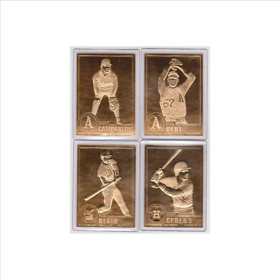 This is 4 Different 1996 Danbury Mint 22kt gold baseball trading cards.  These are still sealed in the holders from the mint.  This includes Paul Blair, Cesar Cedeno, Bert Campaneris and Vida Blue.