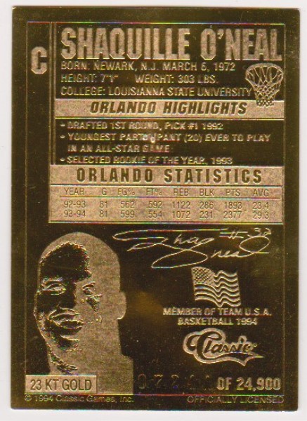23 kt Gold - Shaquille O'Neal 1994 Classic Gold Card (1/24,900)