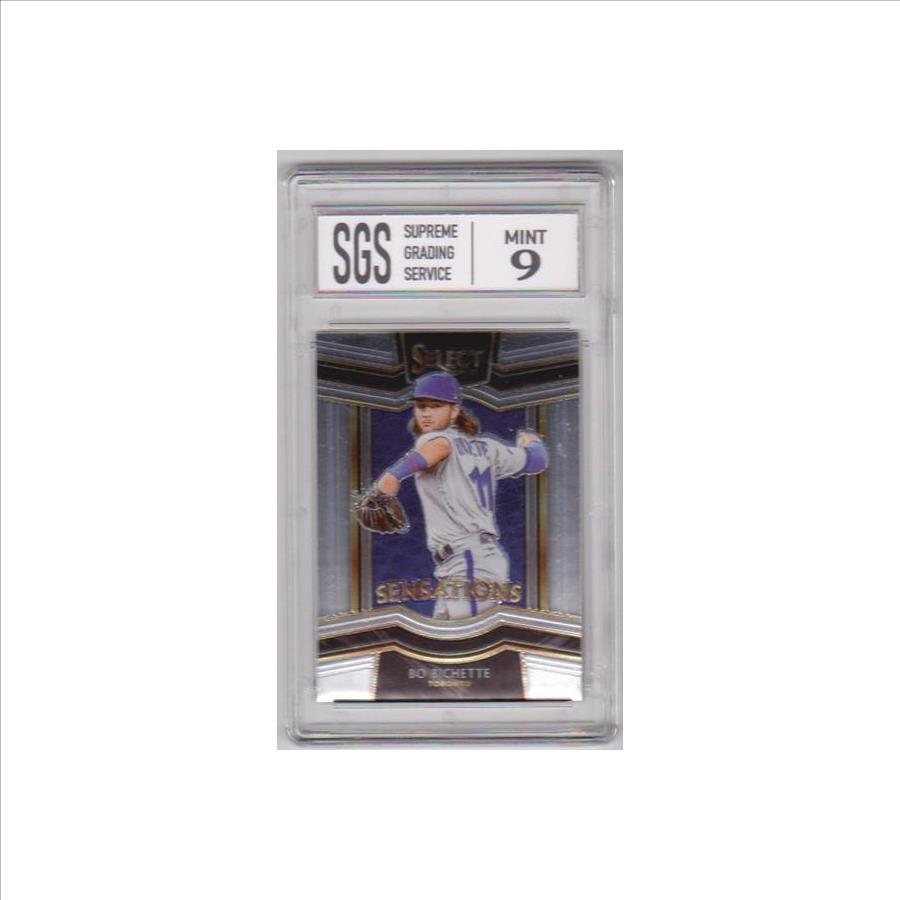 This is a 2021 Panini Select Sensations Bo Bichette #SE-8 insert card that has been graded a Mint 9 by SGS. The holder has some light surface wear, but overall this is a  sharp graded card of this baseball star.