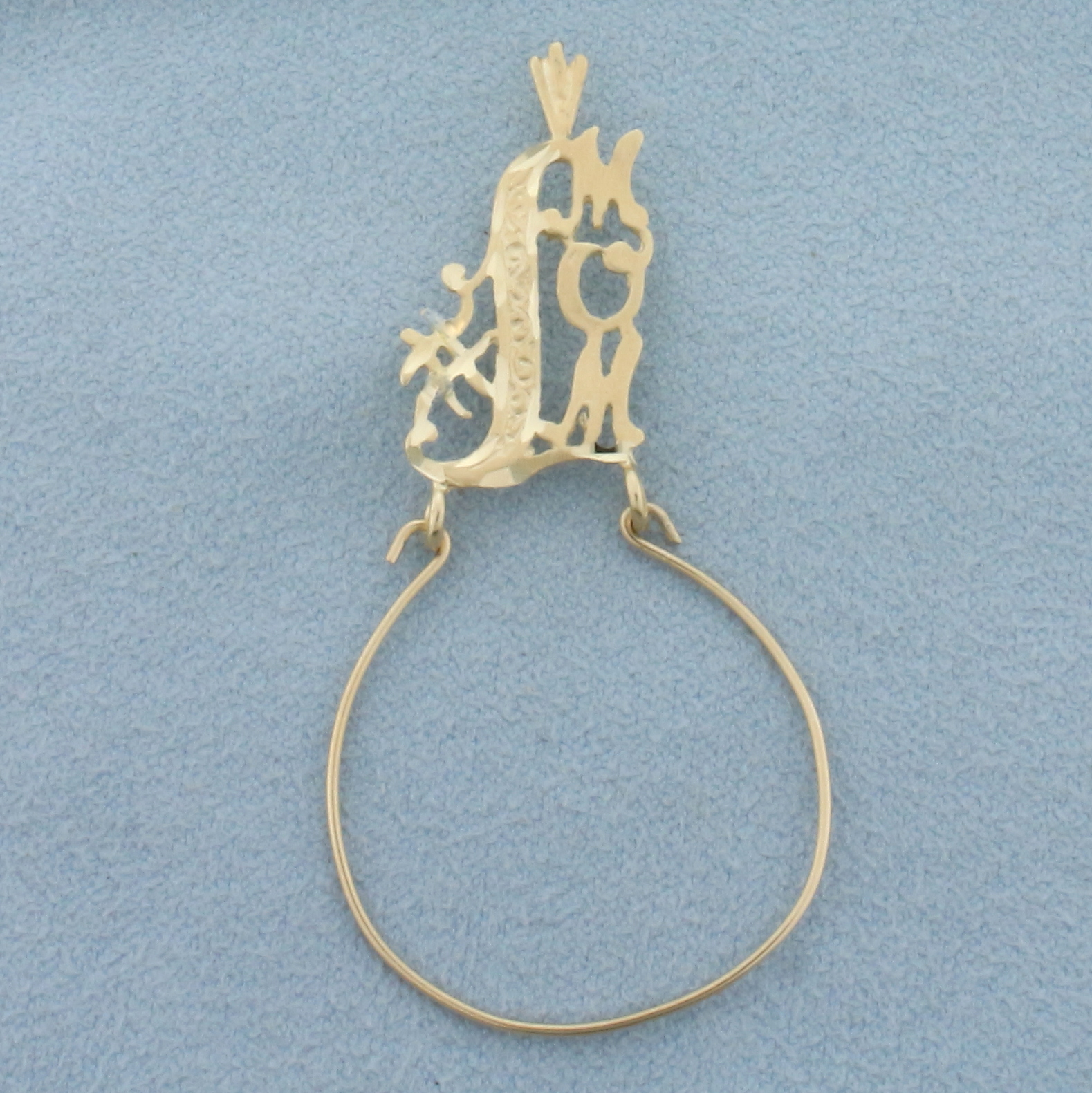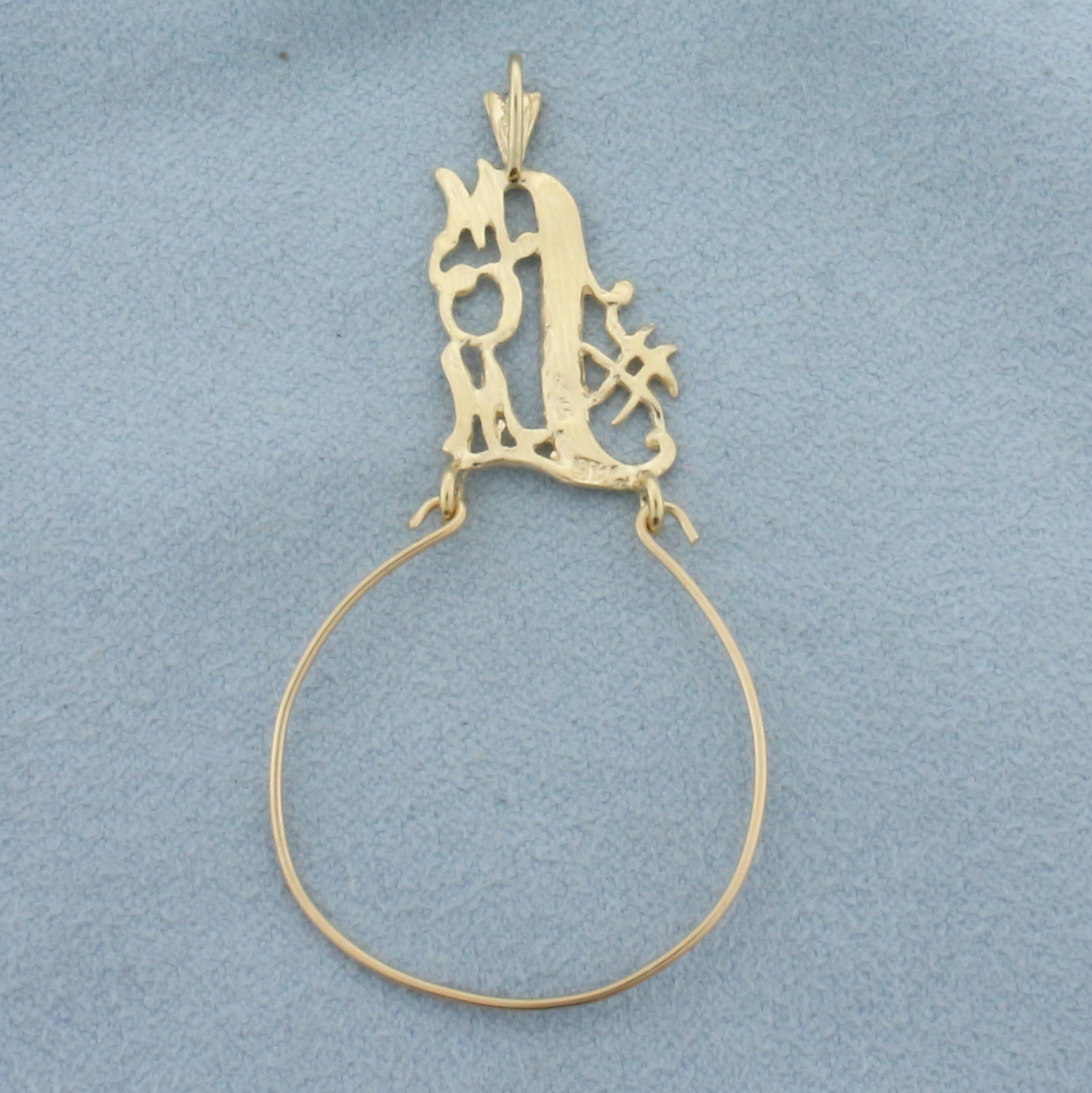 In 14k yellow gold. 2 1/8 inches long x 1 inch wide (hoop). Hoop can be opened to hold charms so they hang from pendant. 1.7g.