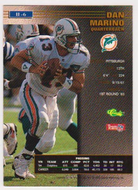 This is a 1995 Pro Line Series II Dan Marino Printer's Proof #II-6 card.  This card was limited to only 725 produced.  This is a very tough insert card of Marino to pull out of packs.  It is in approximately EX to EX-MT condition.  It has a minor wear but overall displays pretty well in a holder.