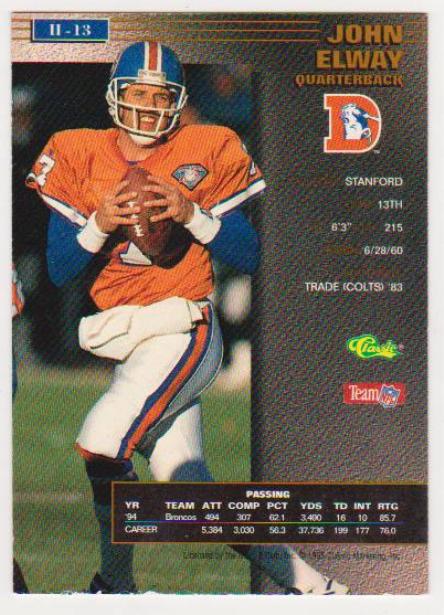 This is a 1995 Pro Line Series II John Elway Printer's Proof #II-13 card.  This card was limited to only 725 produced.  This is a very tough insert card of Elway to pull out of packs.  It is in EX condition.  It has a little corner wear but overall displays pretty well in a holder.