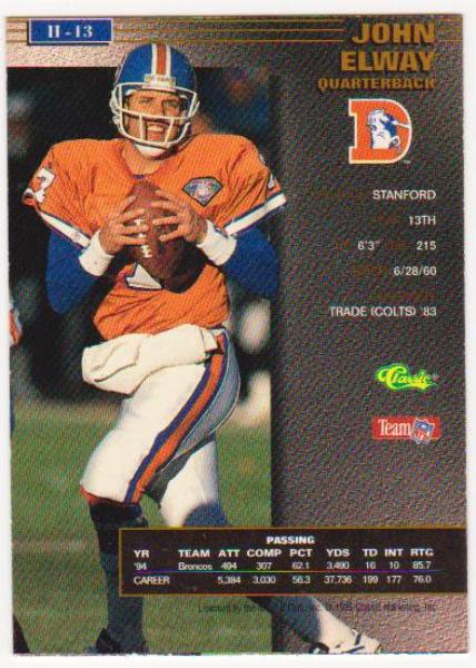 This is a 1995 Pro Line Series II John Elway Printer's Proof #II-13 card.  This card was limited to only 725 produced.  This is a very tough insert card of Elway to pull out of packs.  It is in approximately VG-EX condition.  It has corner/edge wear, but overall displays fairly well in a holder.