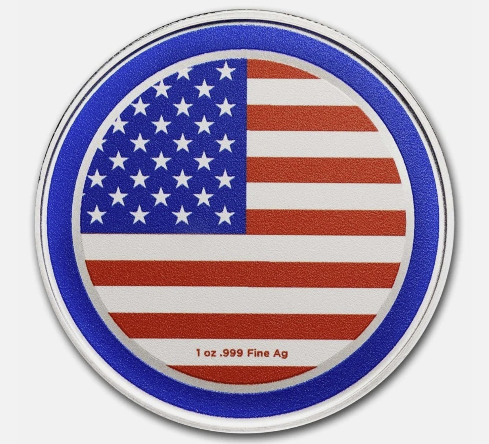 • Reverse: Displays a zoomed-in American flag ringed in silver and blue. Silver weight and purity are shown in red within the bottom white stripe.