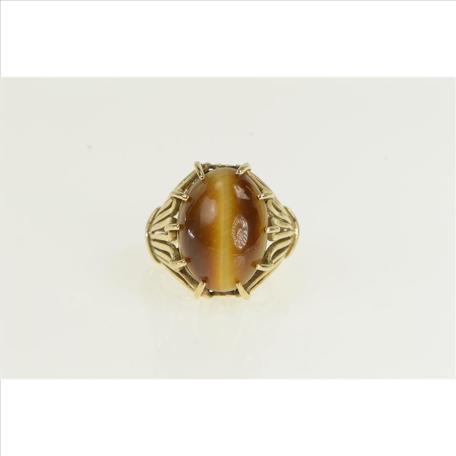 Item:  10K 1960's Oval Tiger's Eye Retro Vintage Yellow Gold Ring, Size 5.75