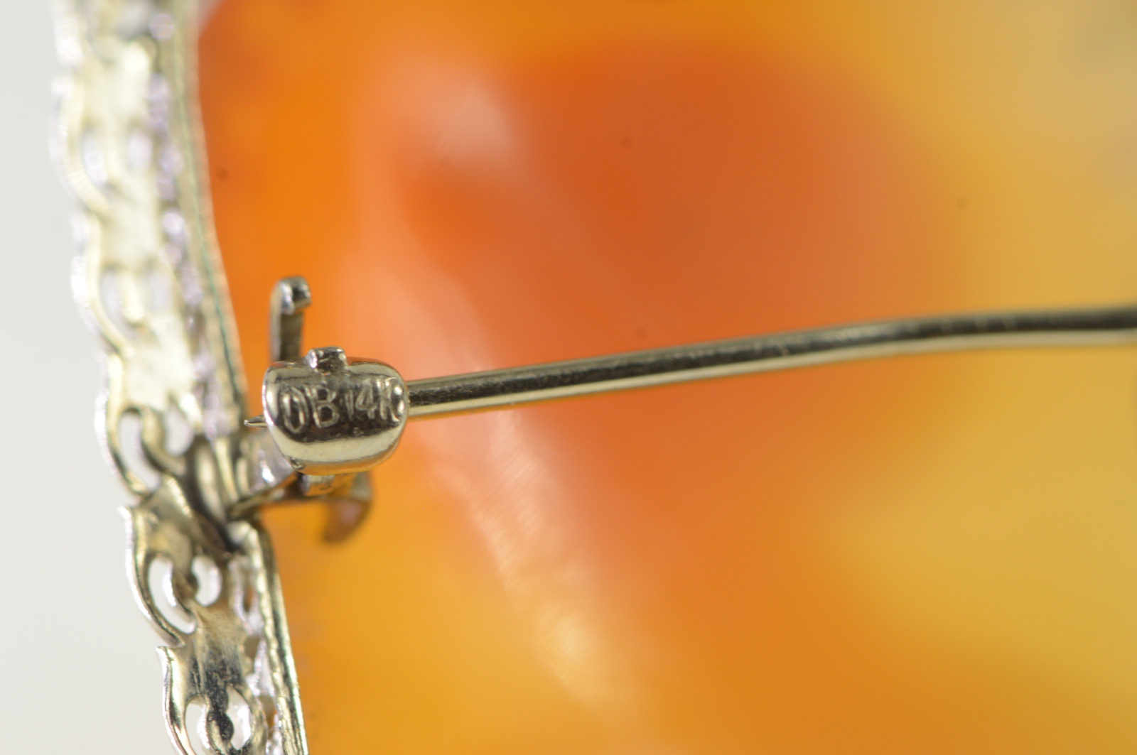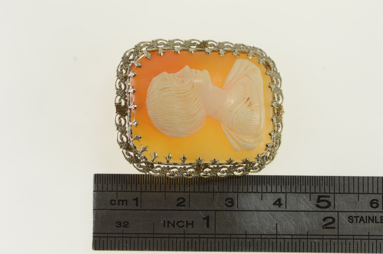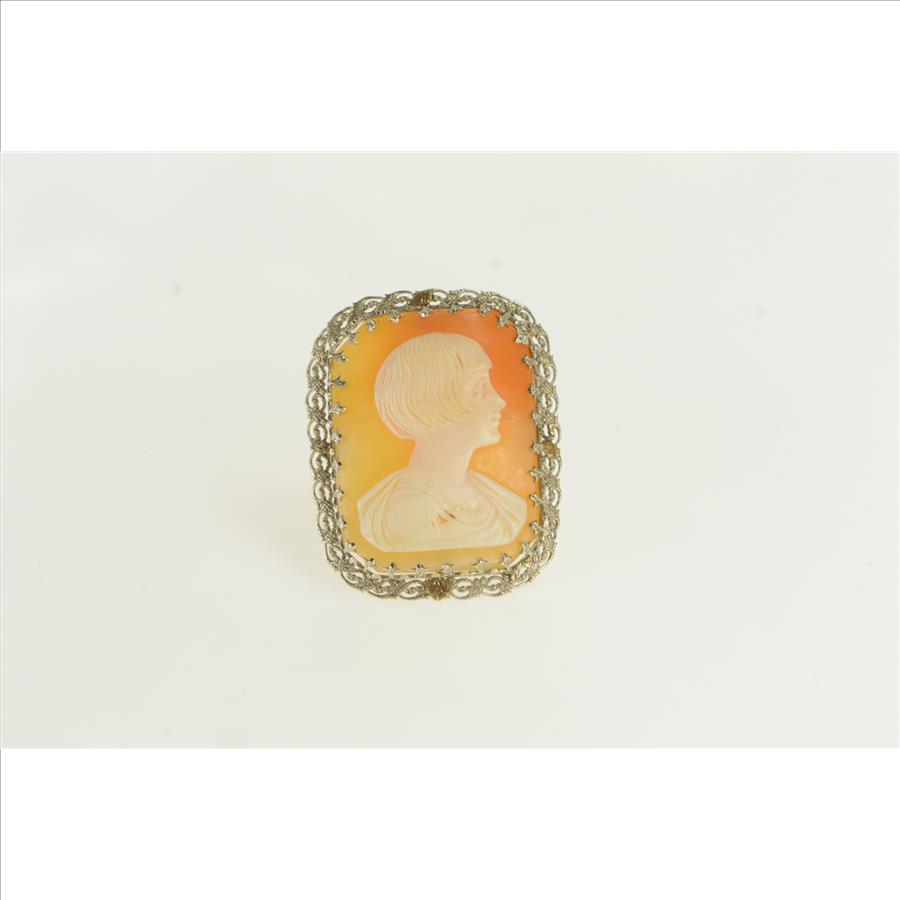 Item:  10K Art Deco Filigree Carved Shell Cameo White Gold Pin/Brooch