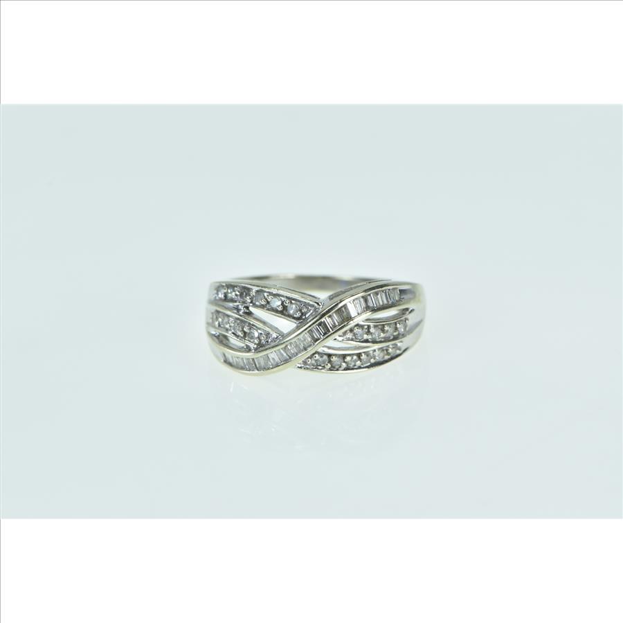 Item:  10K Baguette Wavy Diamond Vintage Statement White Gold Ring, Size 7