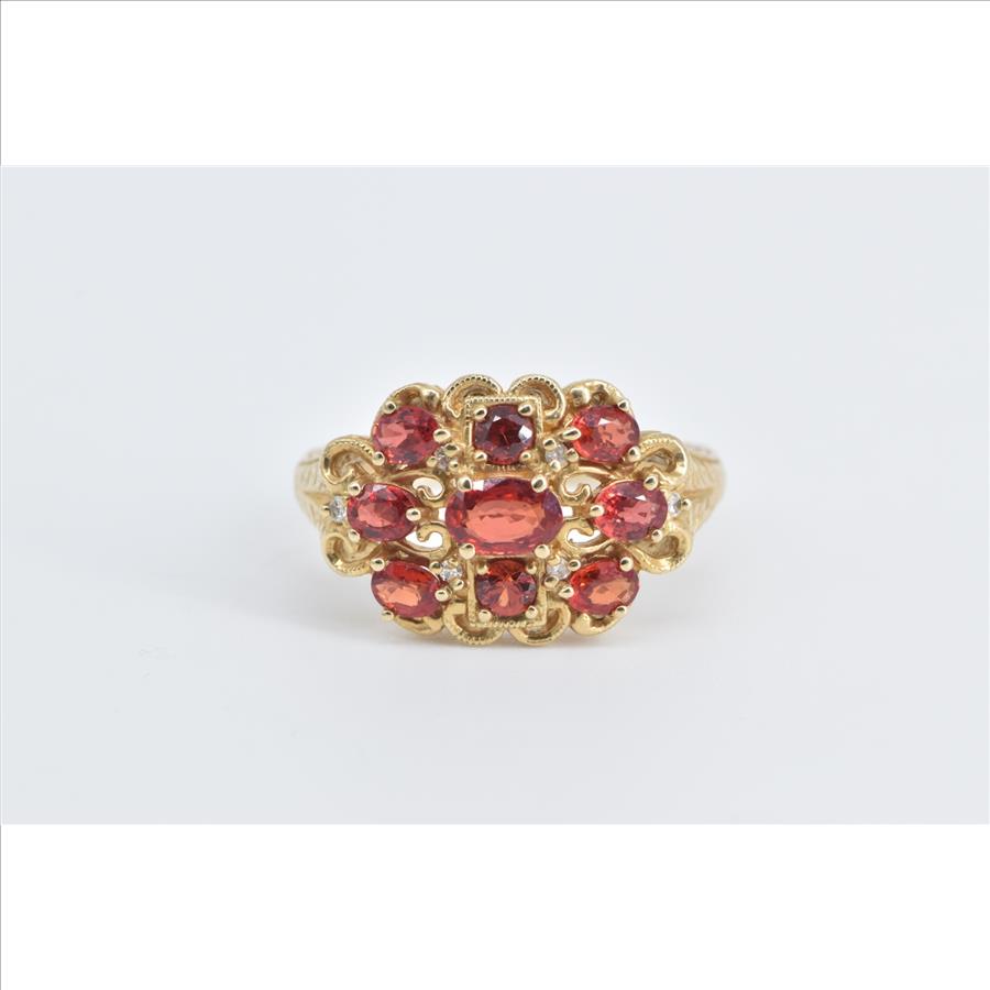 10K Ornate Garnet Diamond Scalloped Statement Yellow Gold Ring, Size 10