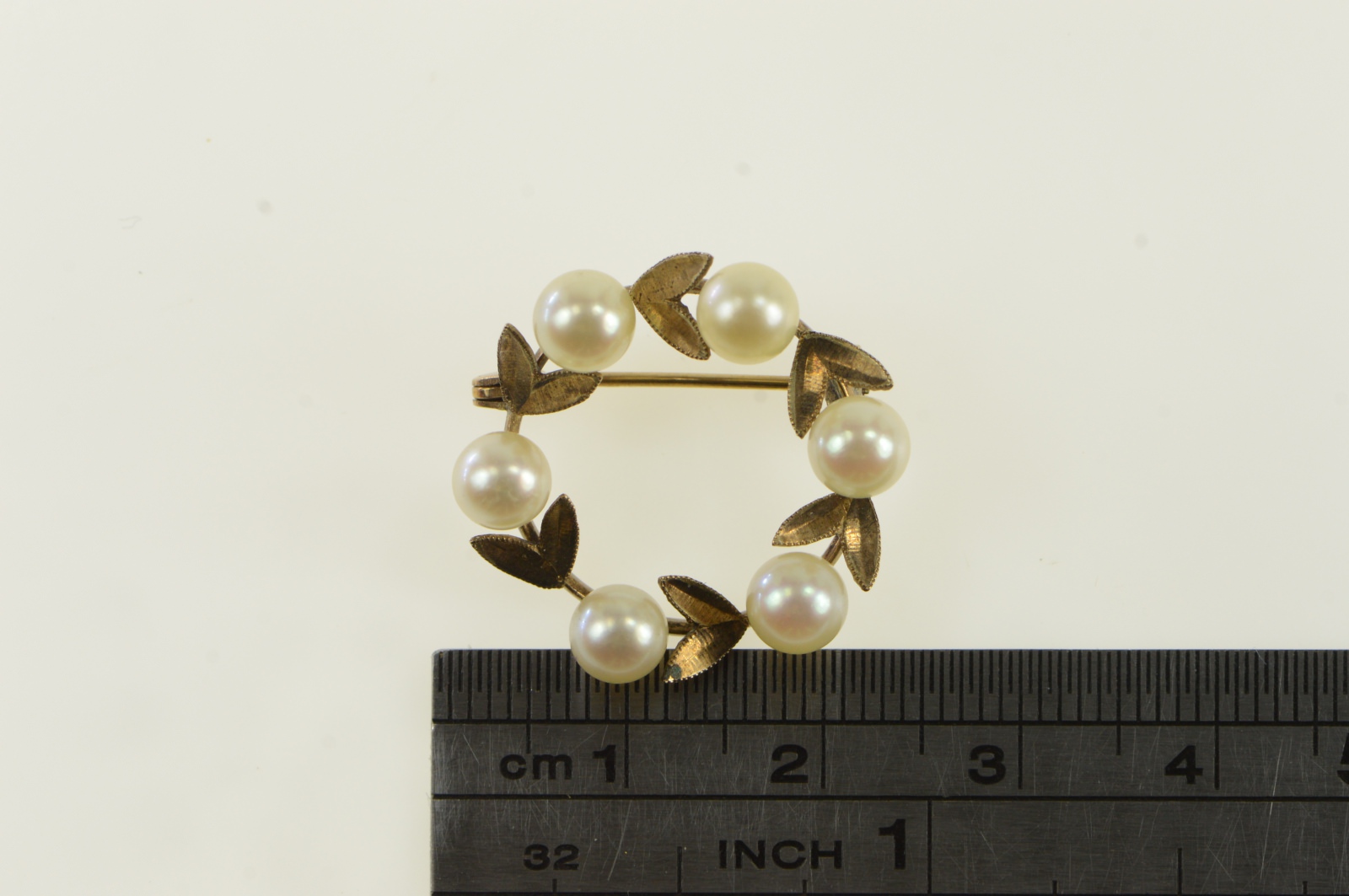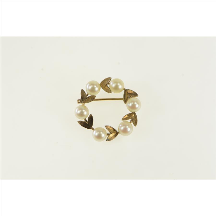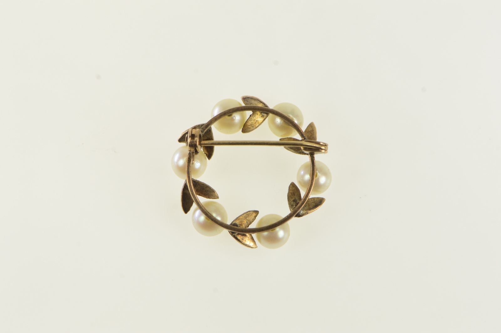 Item:  10K Ornate Pearl Leaf Vine Round Circle Yellow Gold Pendant