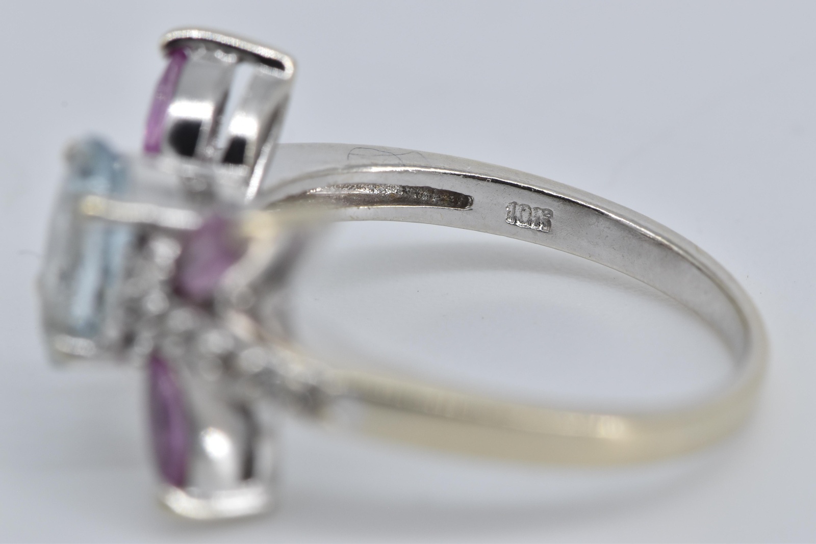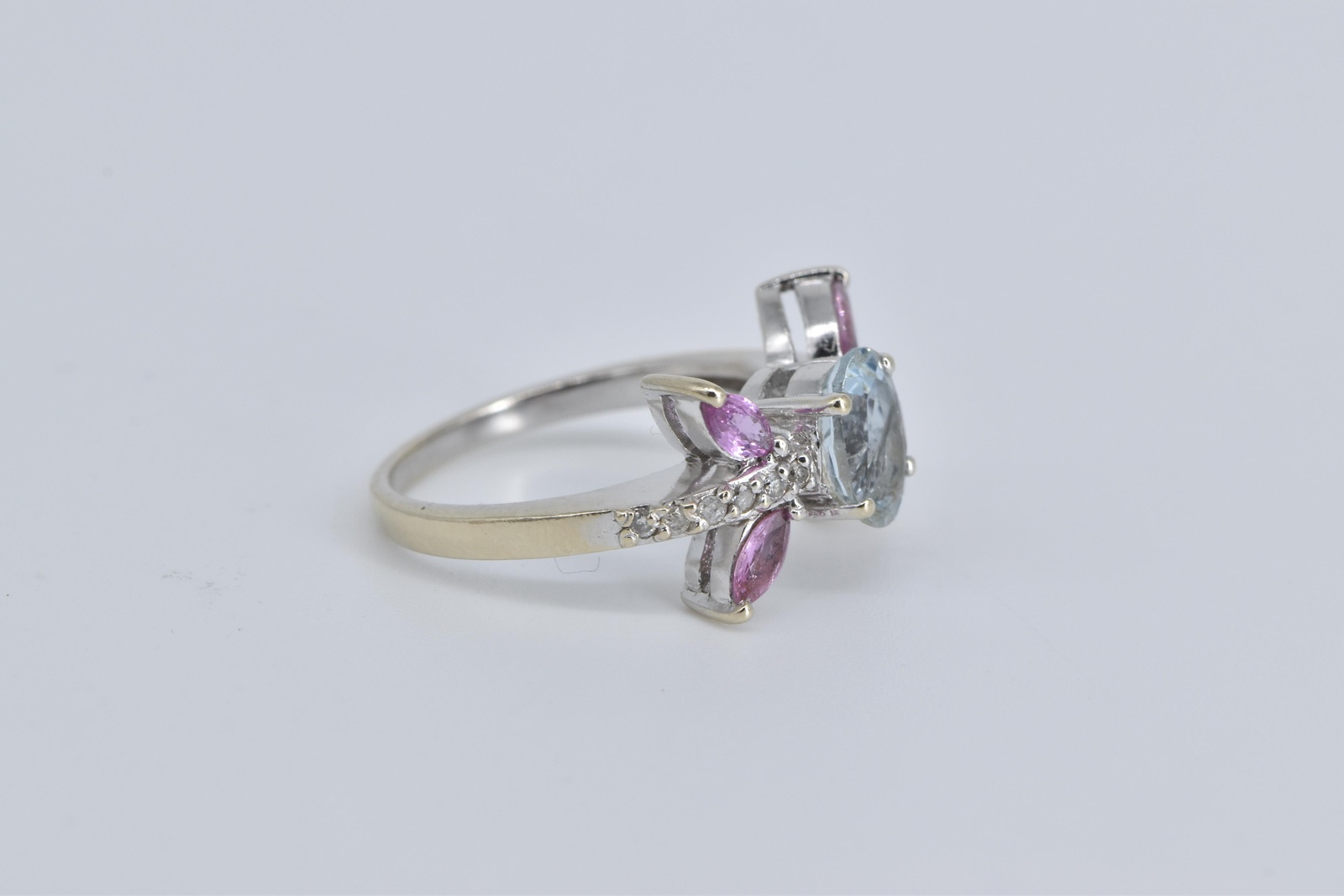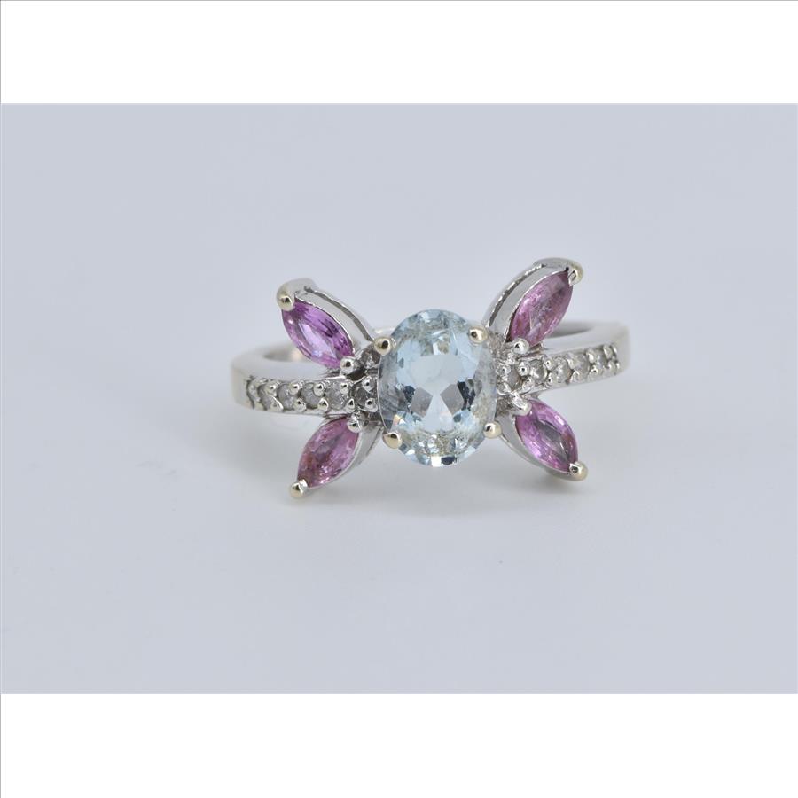 10K Oval Aquamarine Marquise Ruby Diamond White Gold Ring, Size 7
