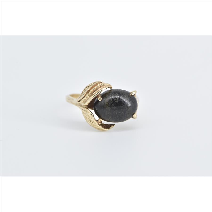 Item:  10K Oval Black Petrified Wood Leaf Vintage Yellow Gold Ring, Size 4.75