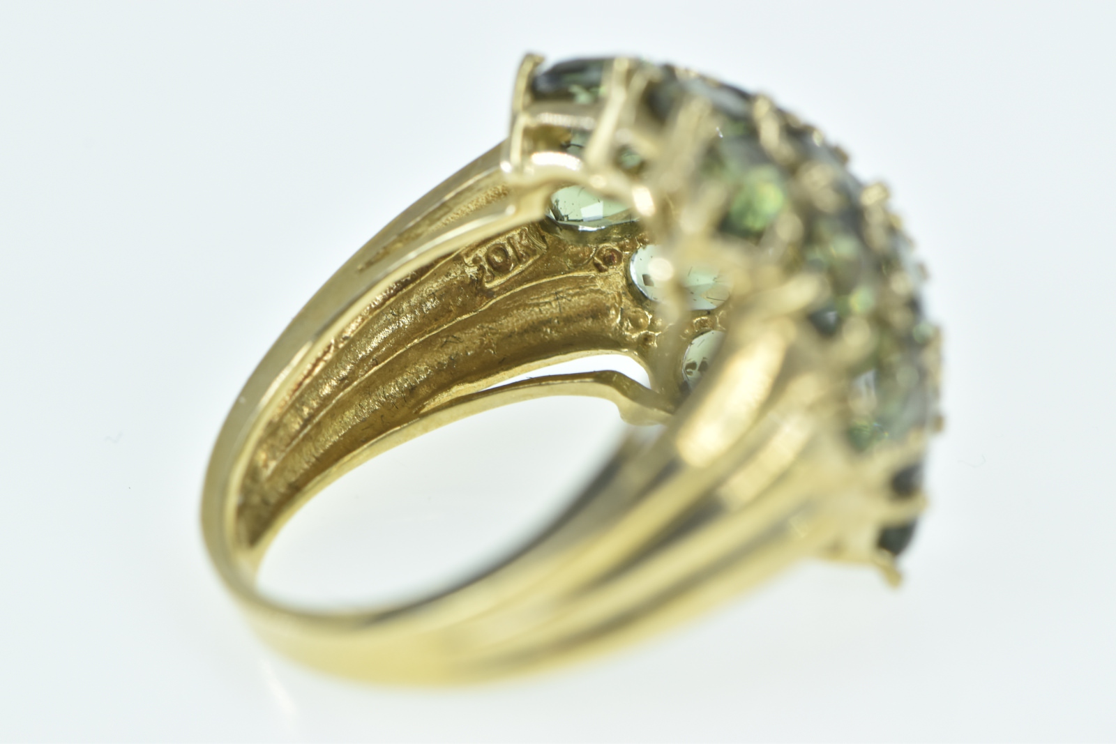 Item:  10K Oval Green Tourmaline Domed Cluster Yellow Gold Ring, Size 5