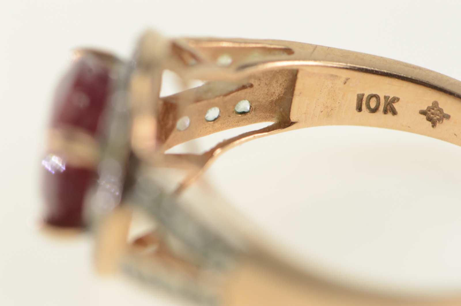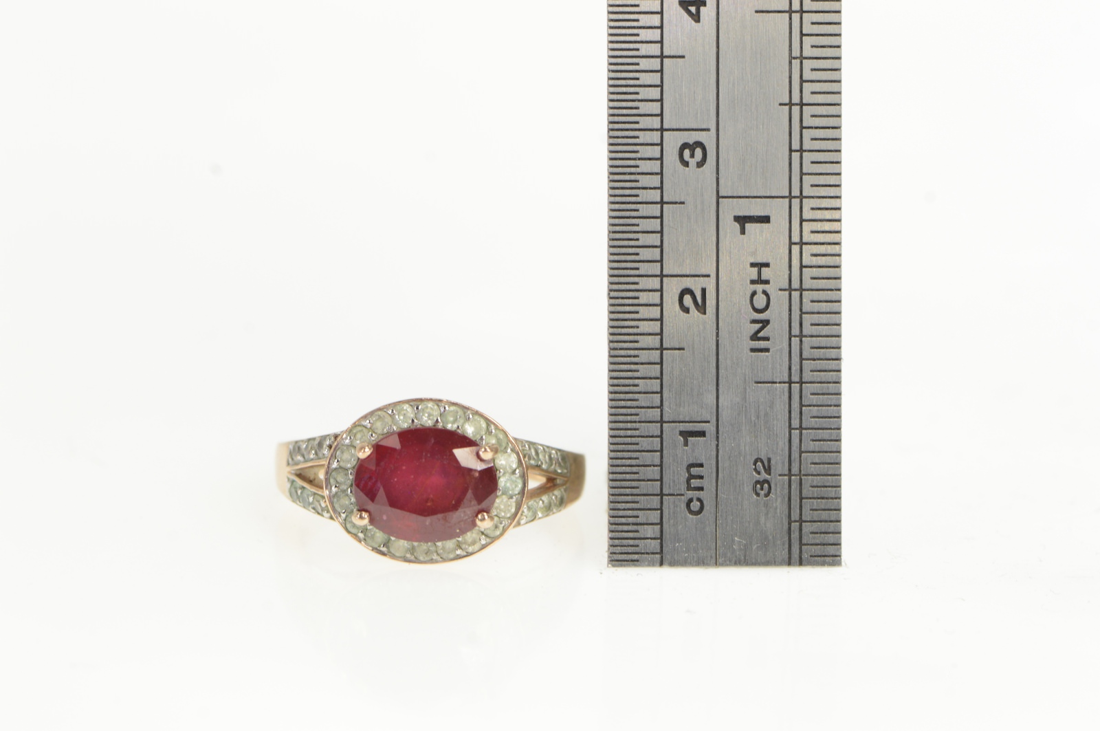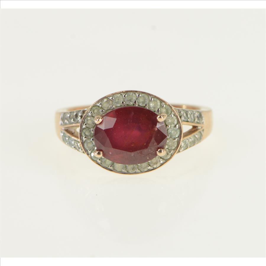 Item:  10K Ruby White Sapphire Halo Engagement Rose Gold Ring, Size 8.25