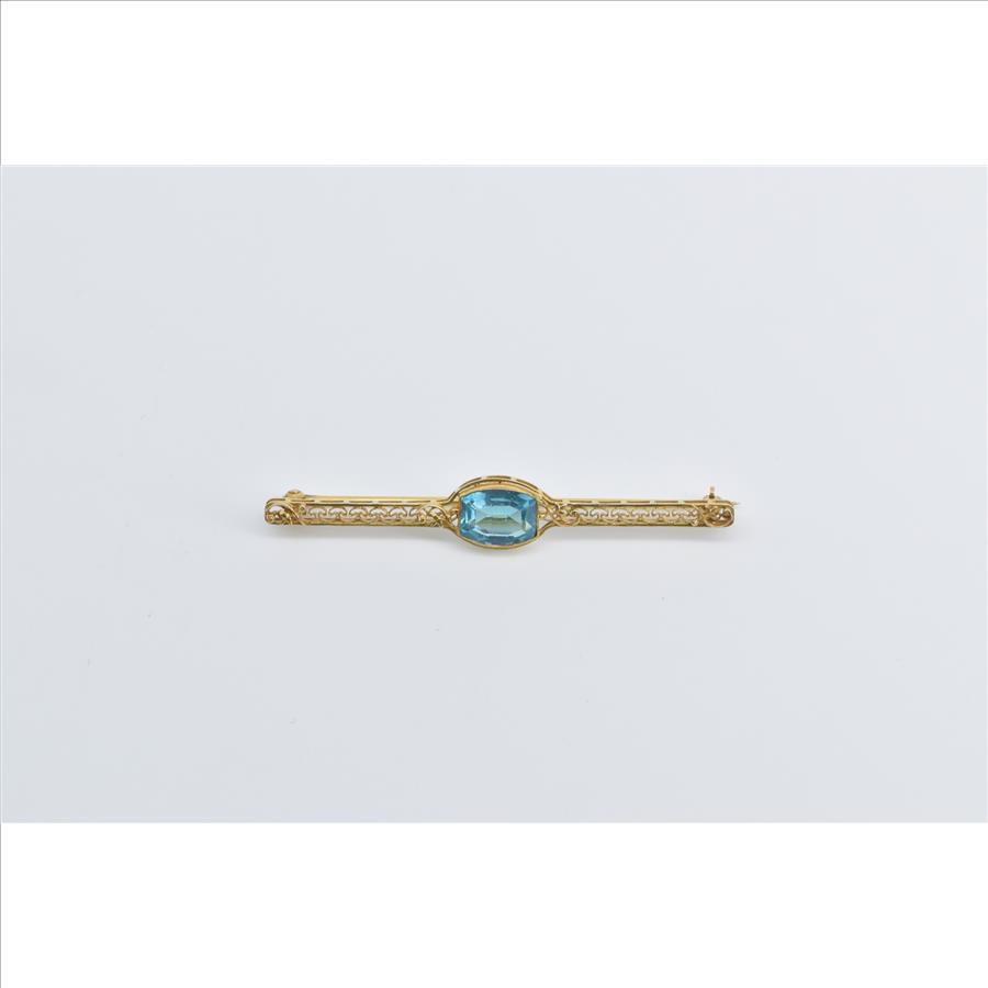 Item:  10K Victorian Blue Topaz Ornate Filigree Bar Yellow Gold Pin/Brooch