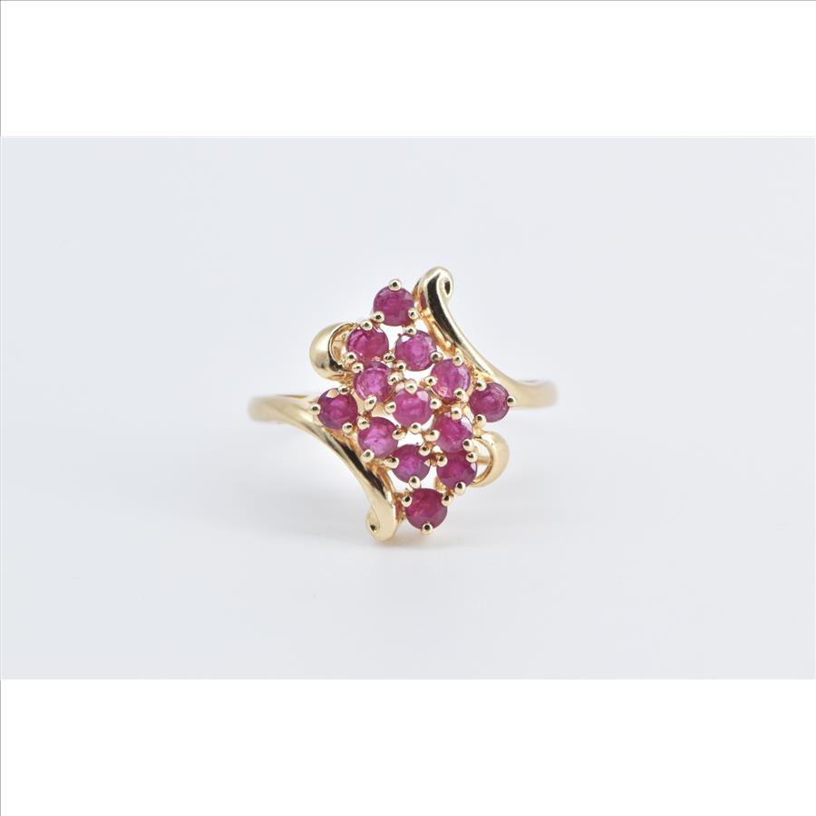 Item:  10K Vintage Natural Ruby Cluster Curvy Freeform Yellow Gold Ring, Size 8