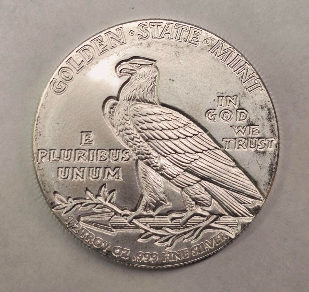 1/2 oz Incuse Indian Fractional – .999 Fine Silver Round – Golden State Mint – BU