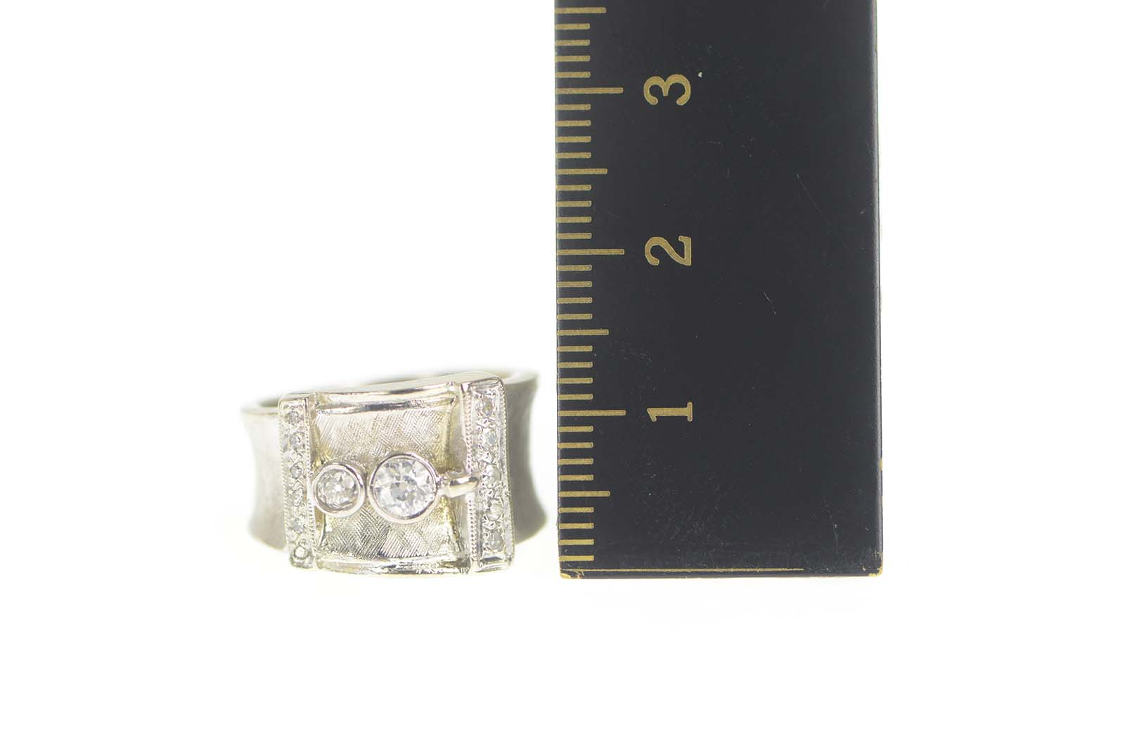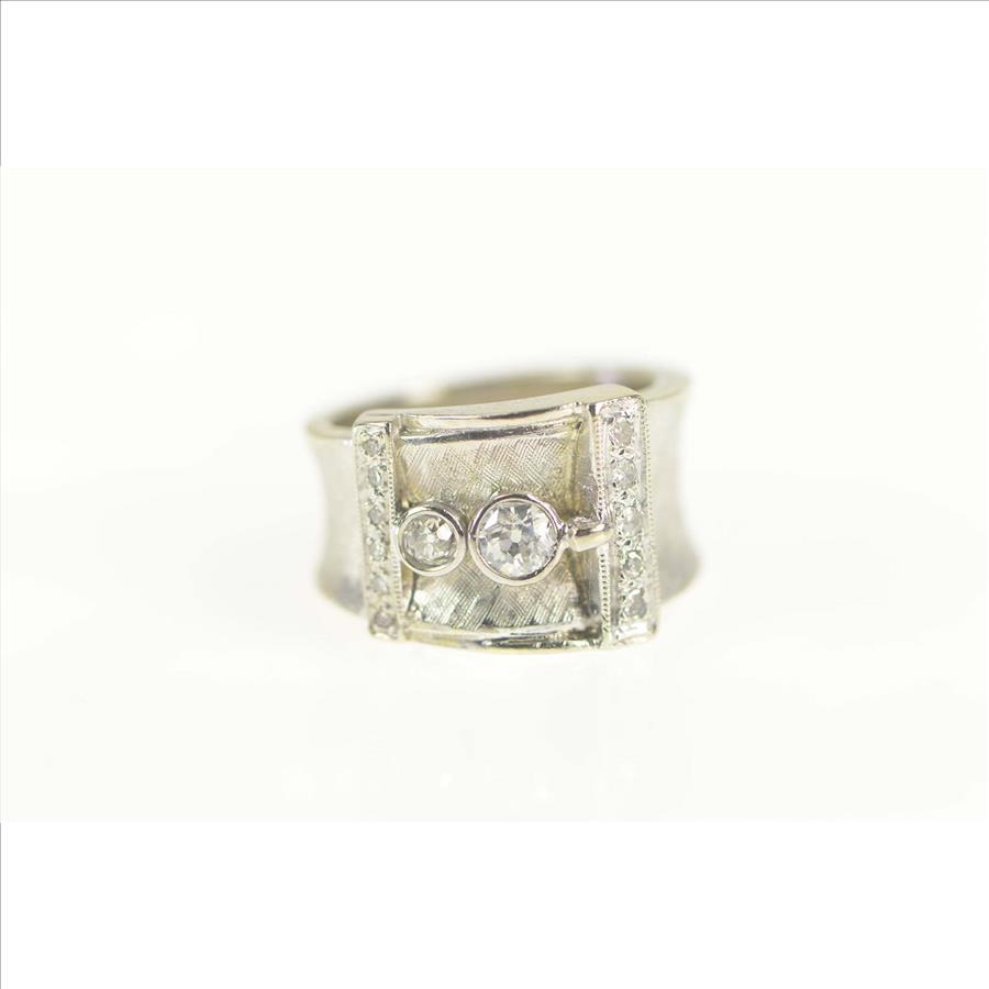 Item:  14K 1930's 0.61 Ctw Old European Diamond Buckle White Gold Ring, Size 5