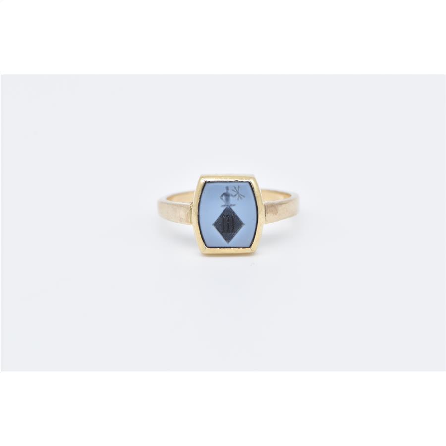 Item:  14K Arrow Harvest Carved Agate Signet Wax Seal Yellow Gold Ring, Size 7