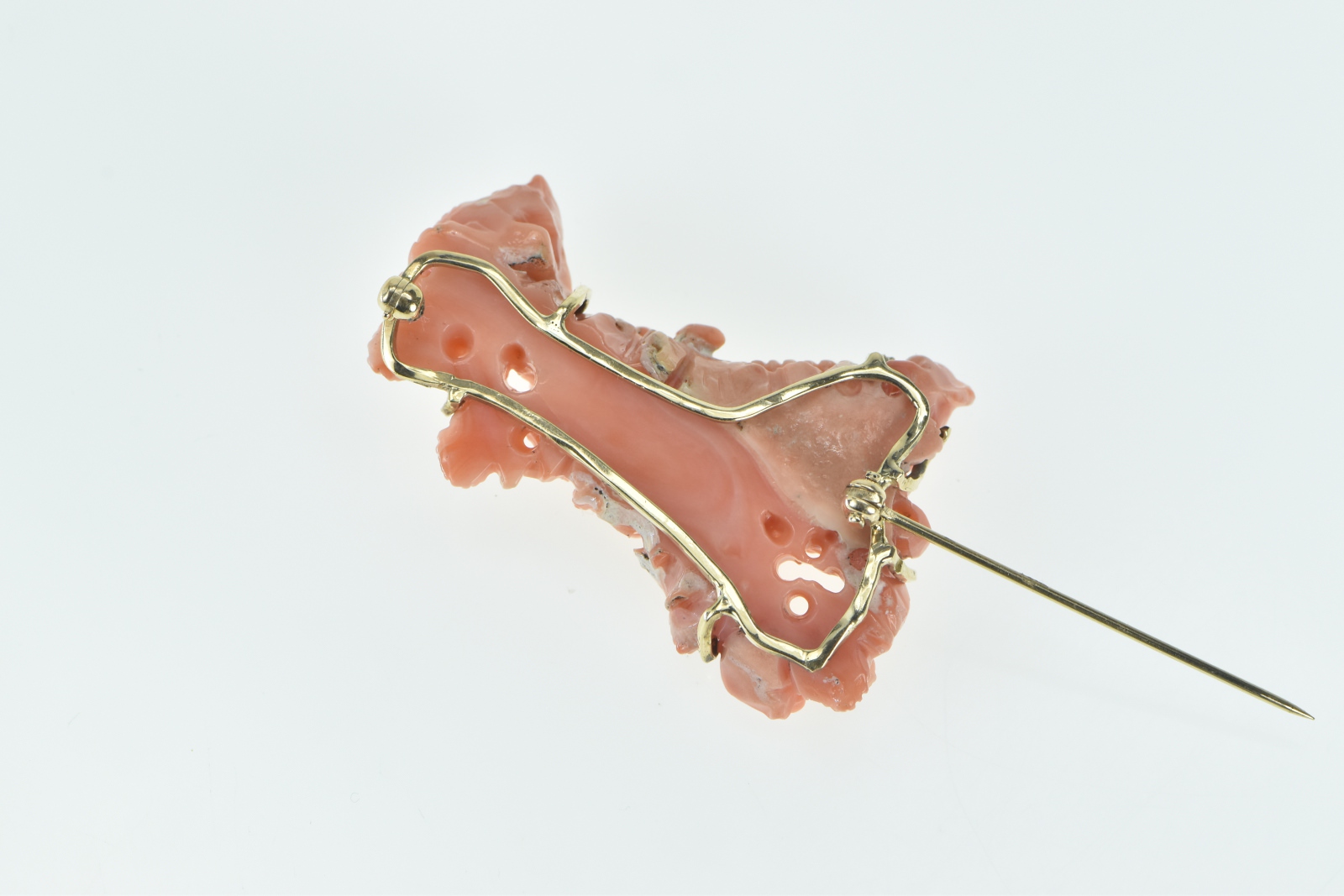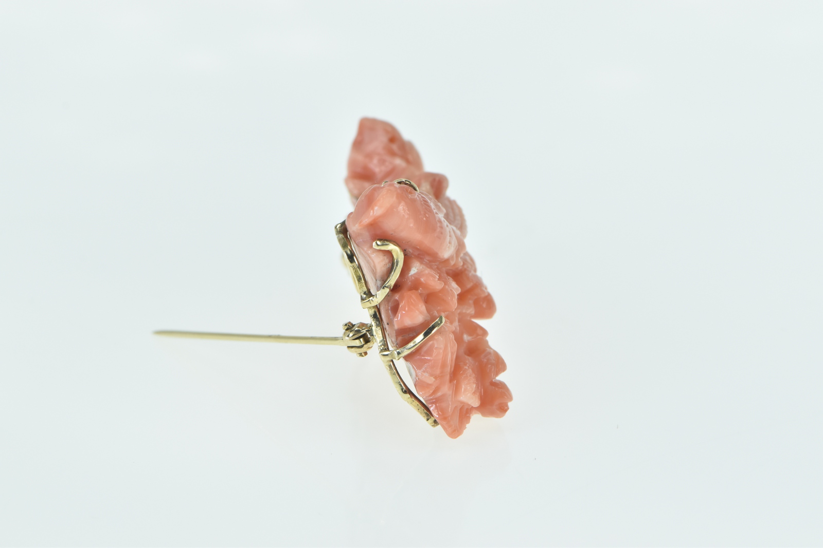 14K Carved Peach Coral Ornate Bird Nature Scene Yellow Gold Pin/Brooch