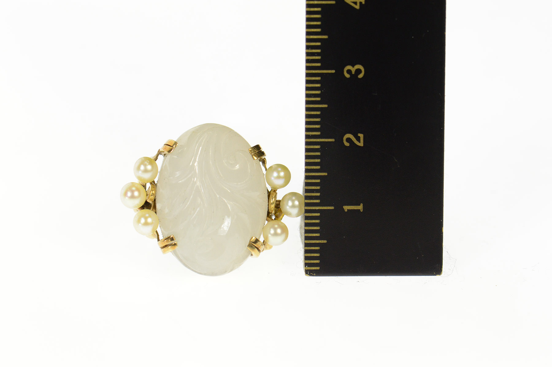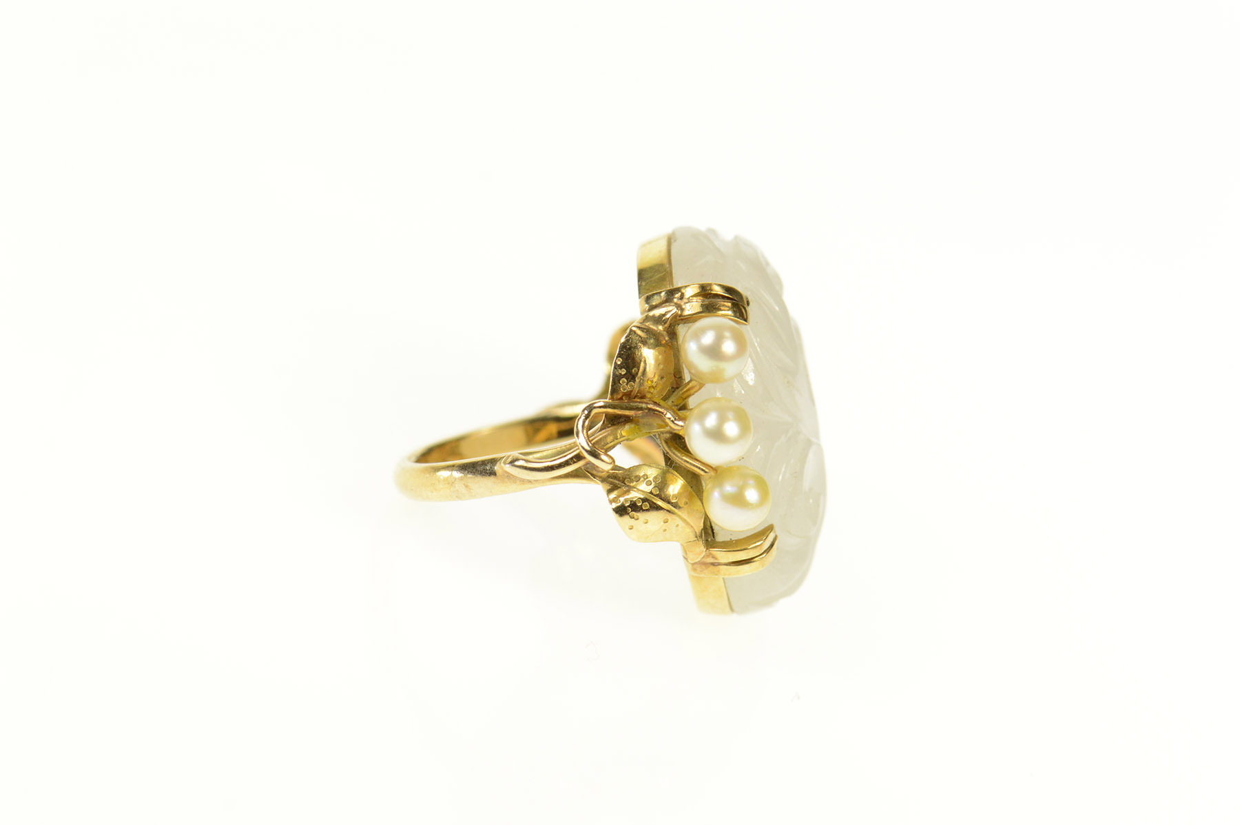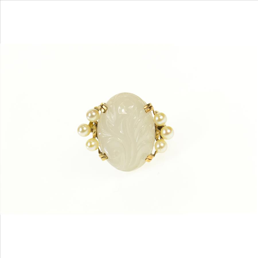 14K Carved Swirl Quartz Retro Pearl Accent Yellow Gold Ring, Size 3.5