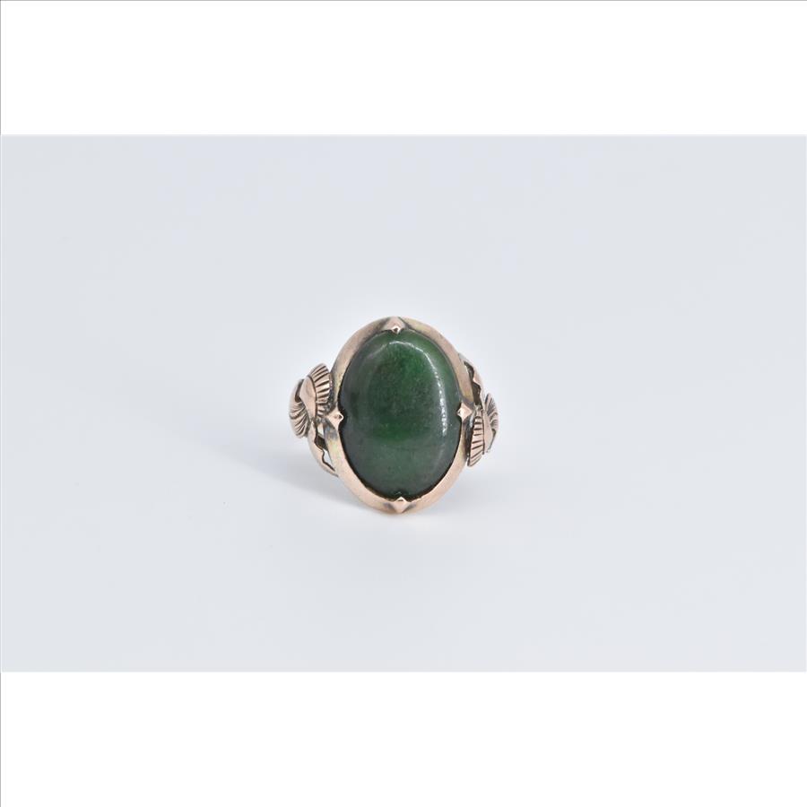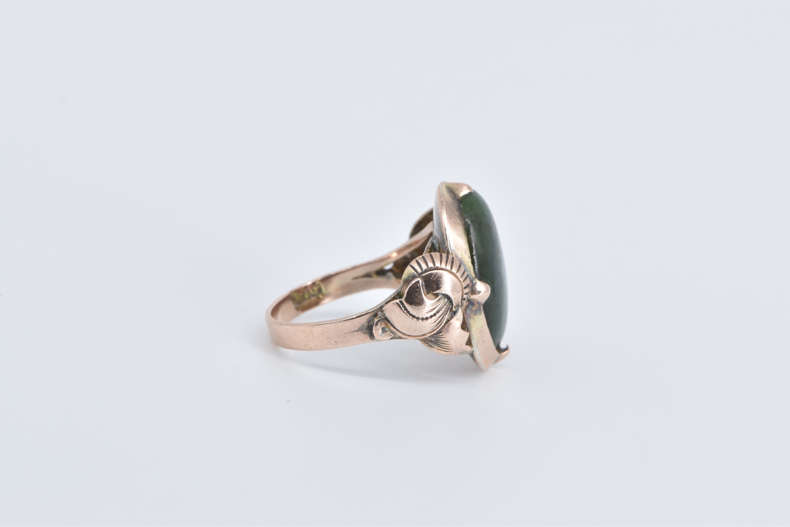Item:  14K Egyptian Revival Ornate Green Stone Swirl Rose Gold Ring, Size 5.5