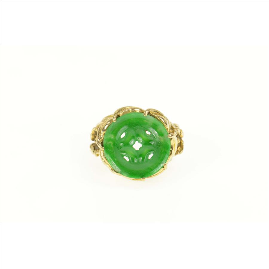 Item:  14K Elaborate Carved Jade Circle Calla Lily Yellow Gold Ring, Size 6.75