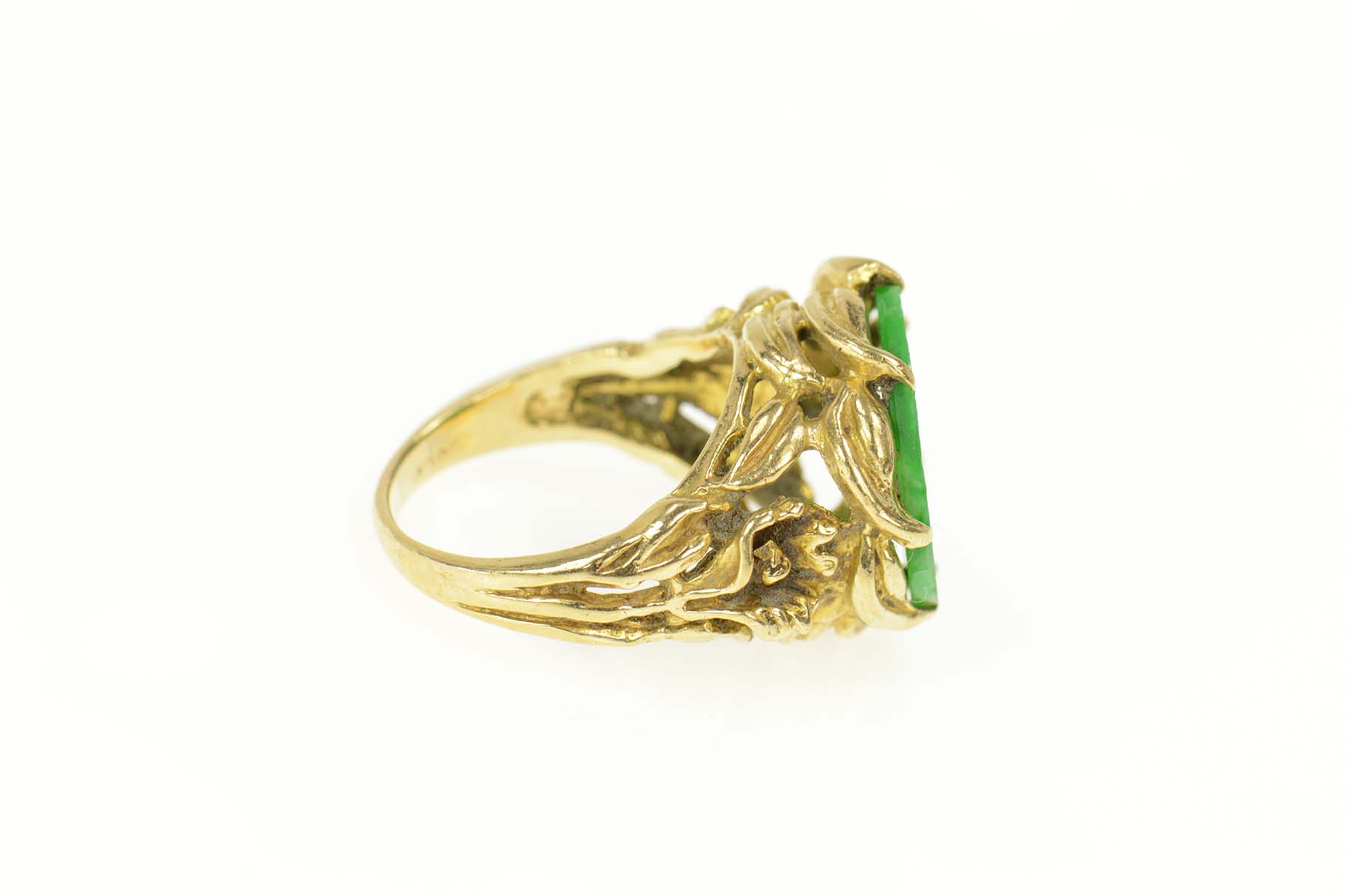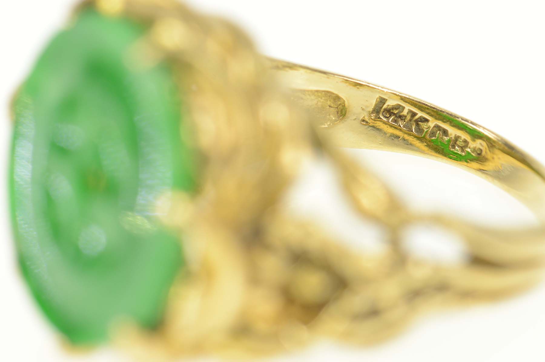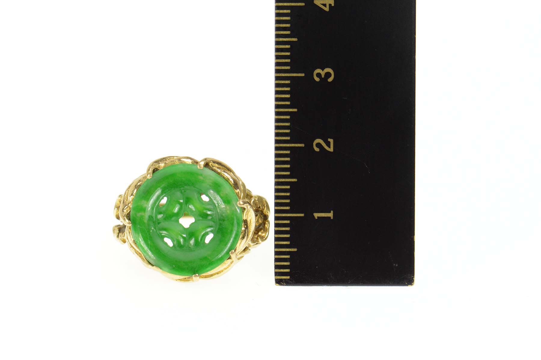 14K Elaborate Carved Jade Circle Calla Lily Yellow Gold Ring, Size 6.75
