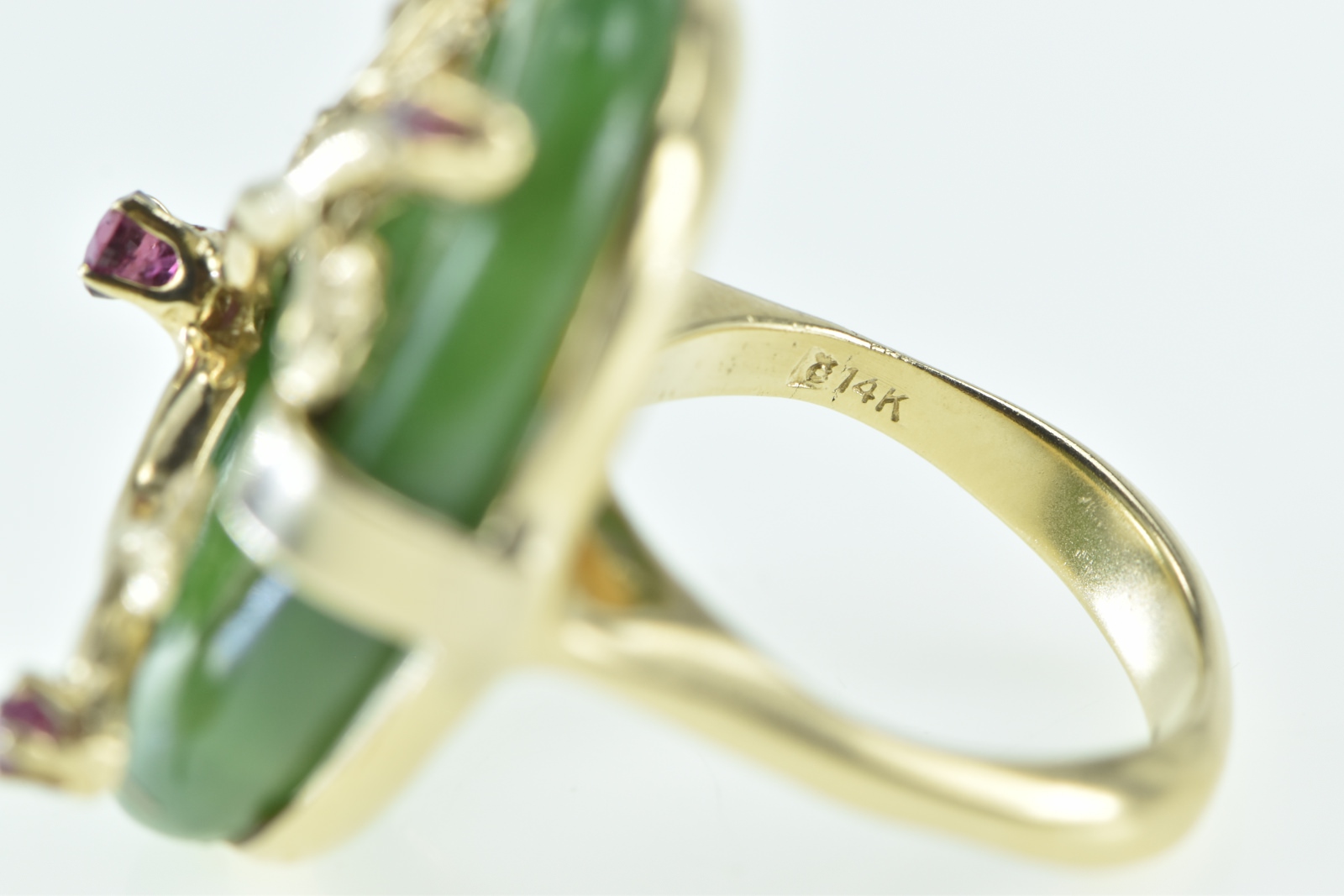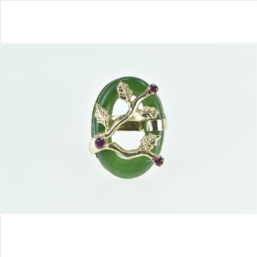 14K Jade Ring Ruby Tree Branch Cherry Blossom Yellow Gold Ring, Size 6