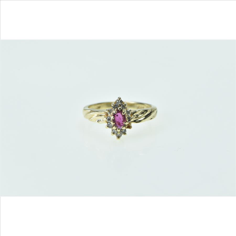 Item:  14K Marquise Ruby Diamond Halo Vintage Yellow Gold Ring, Size 4