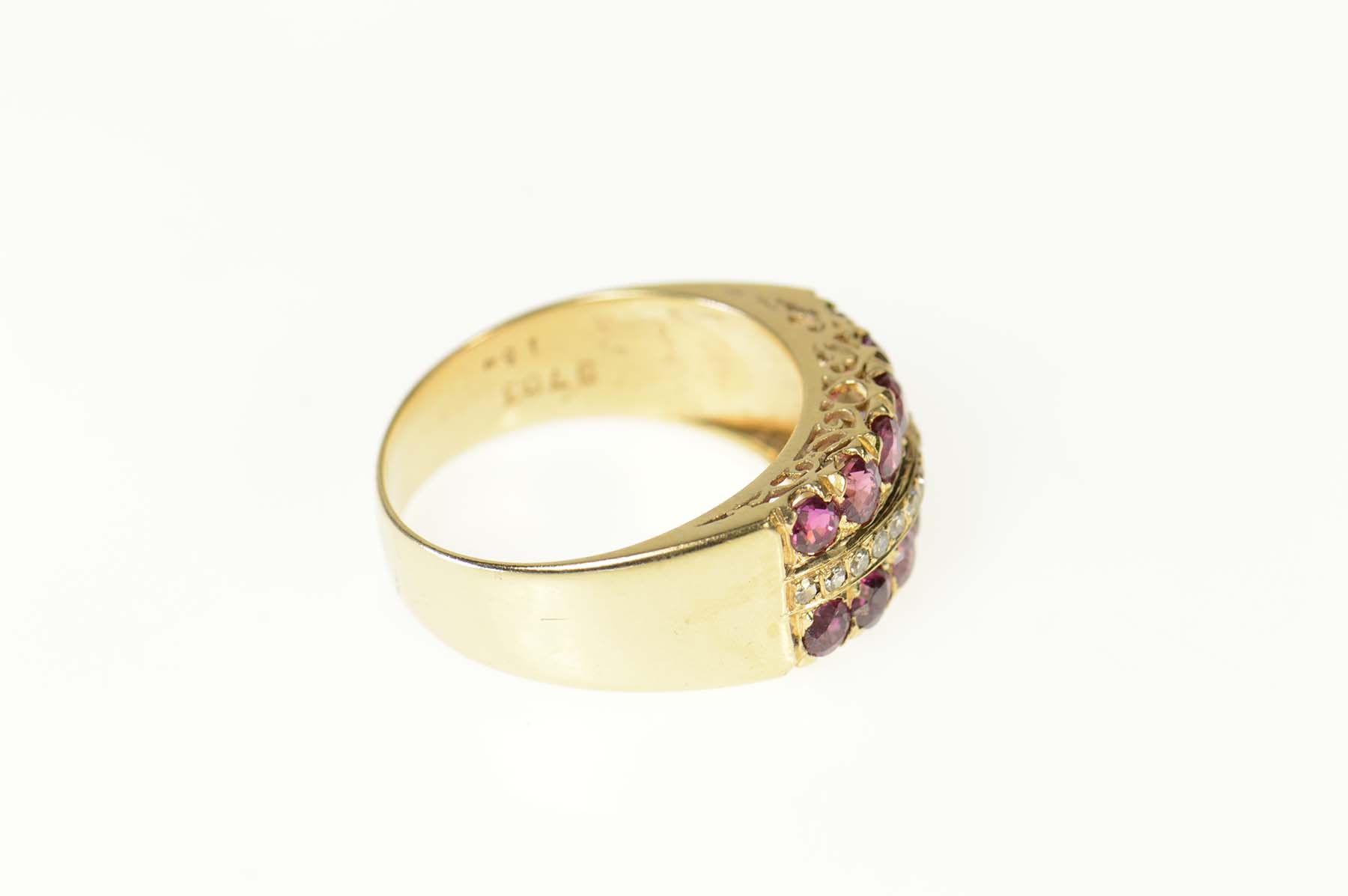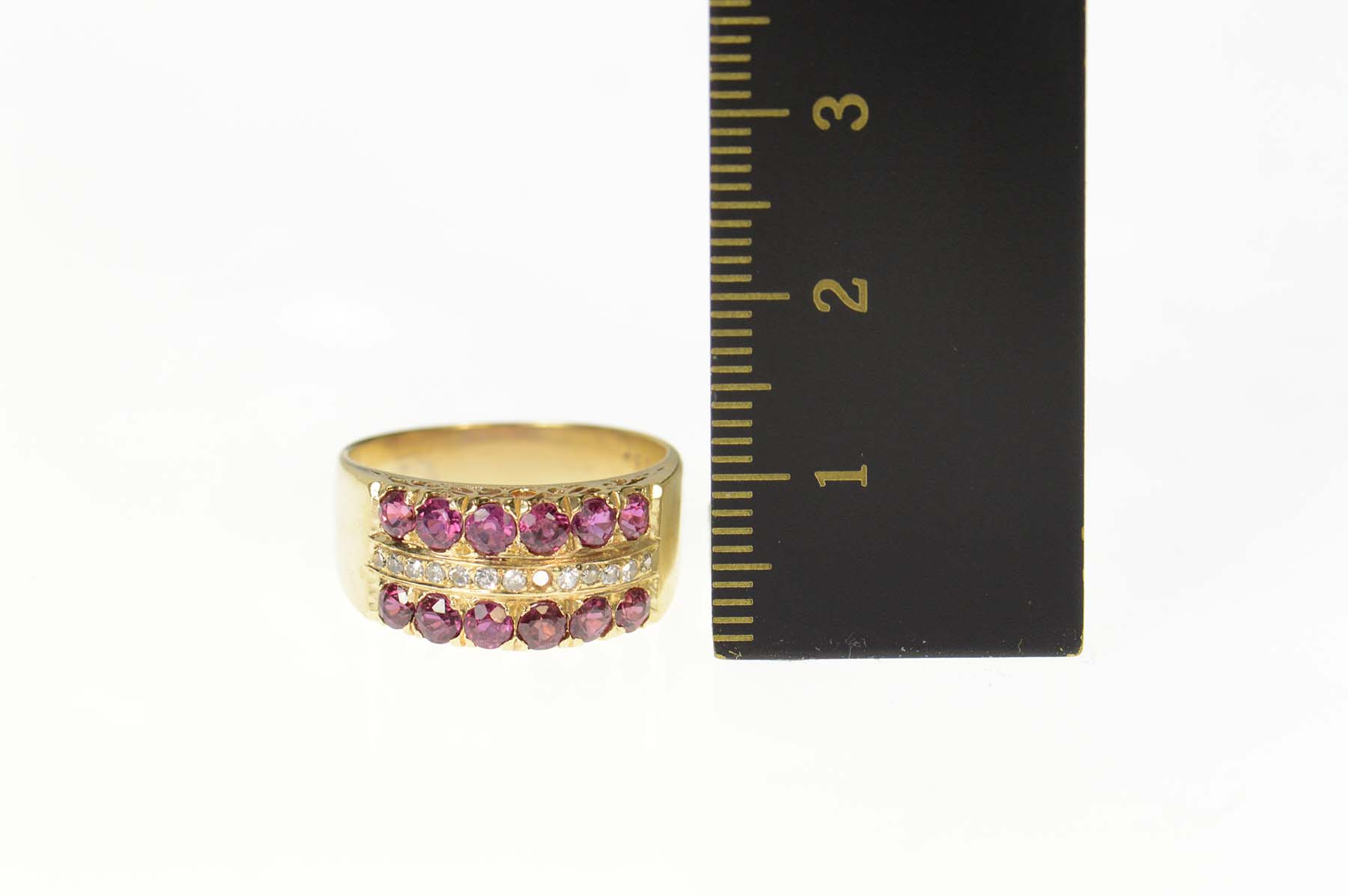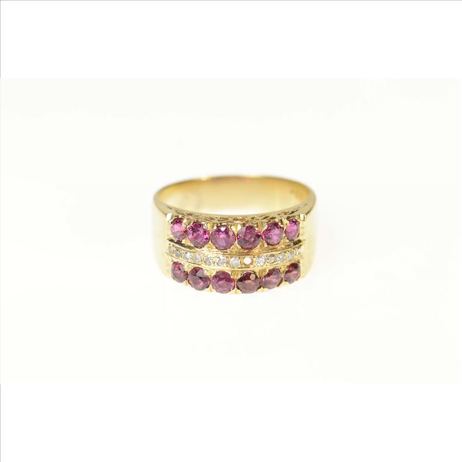 Item:  14K Ornate Ruby Diamond Filigree Band Yellow Gold Ring, Size 6.75
