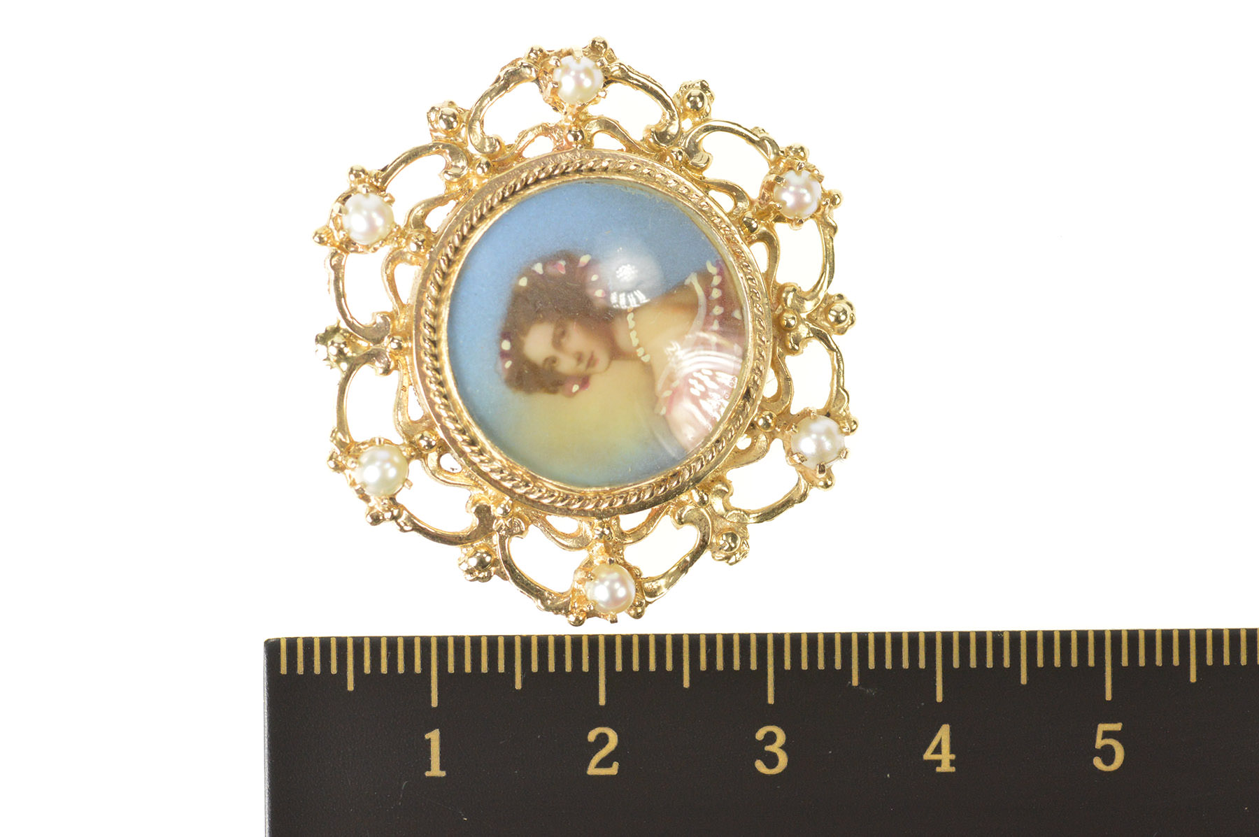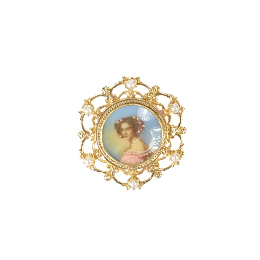 Item:  14K Ornate Victorian Painted Lady Pearl Scroll Yellow Gold Pendant/Pin