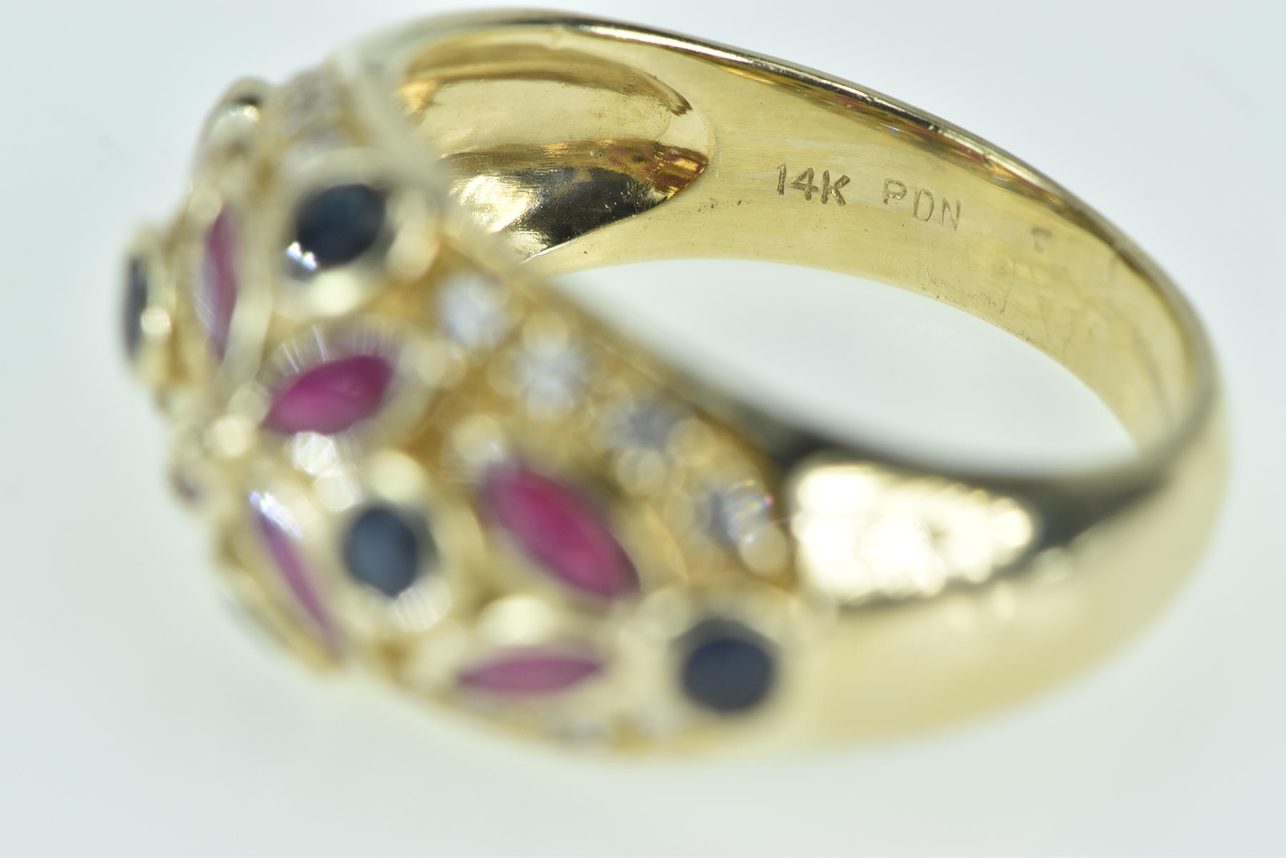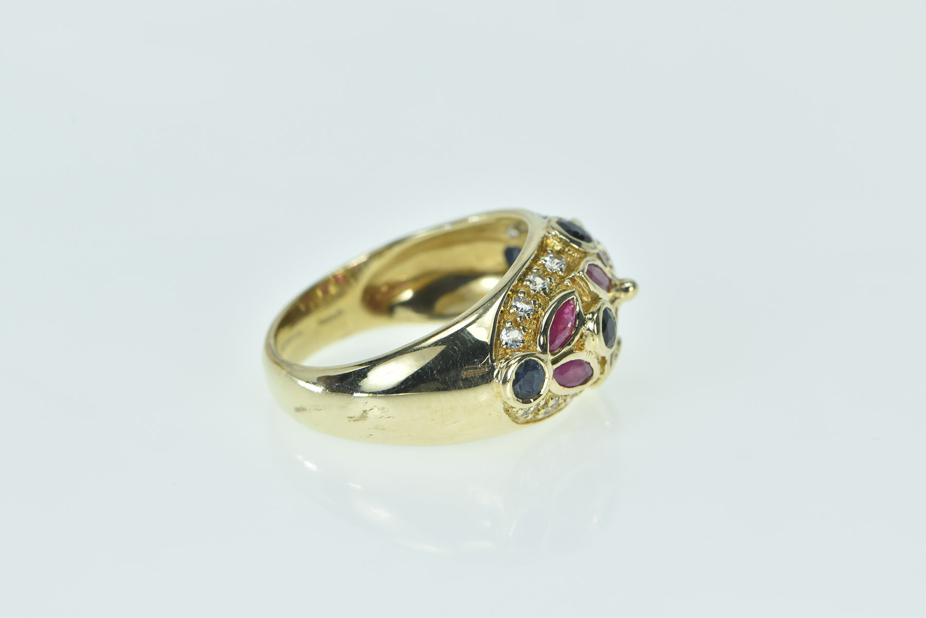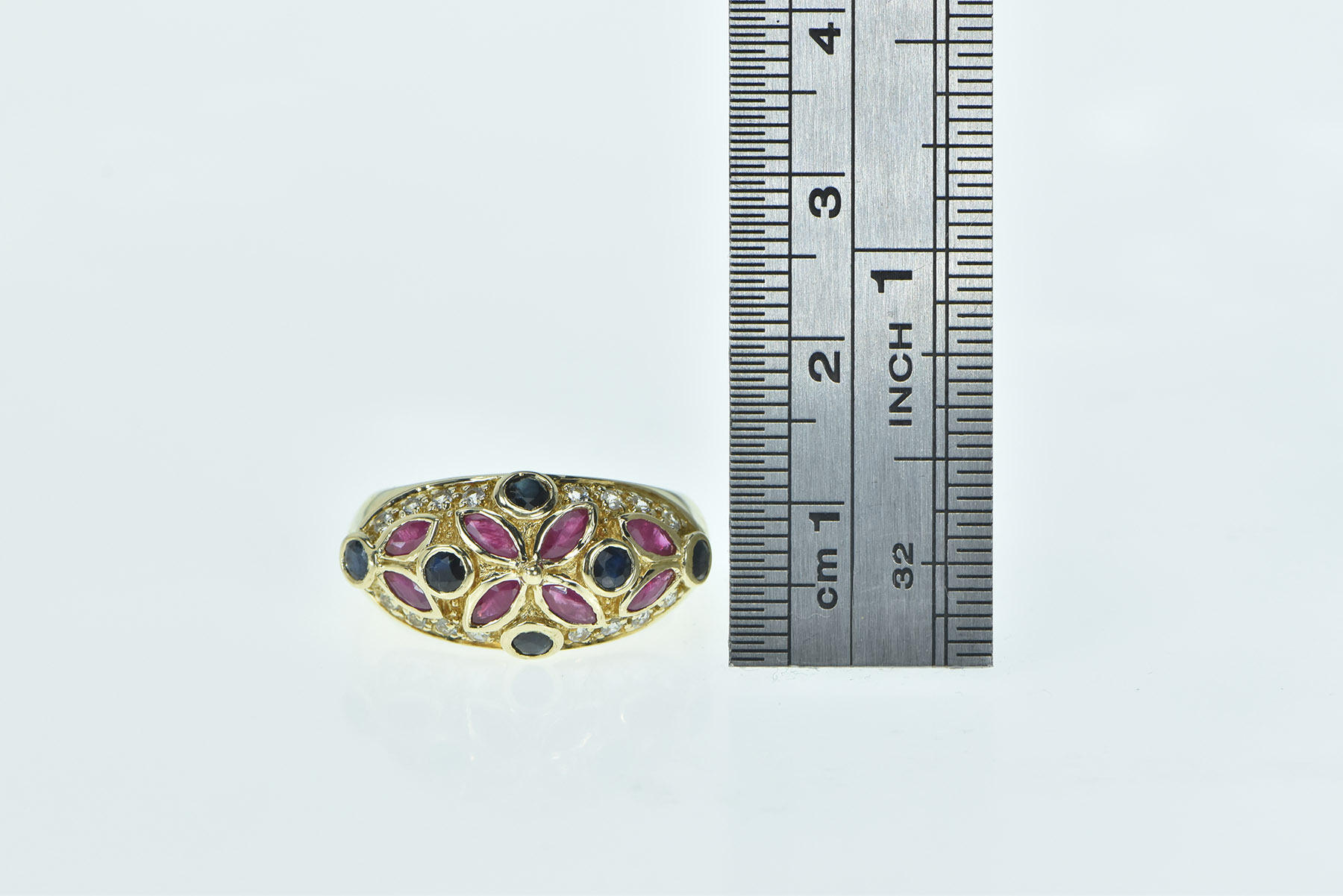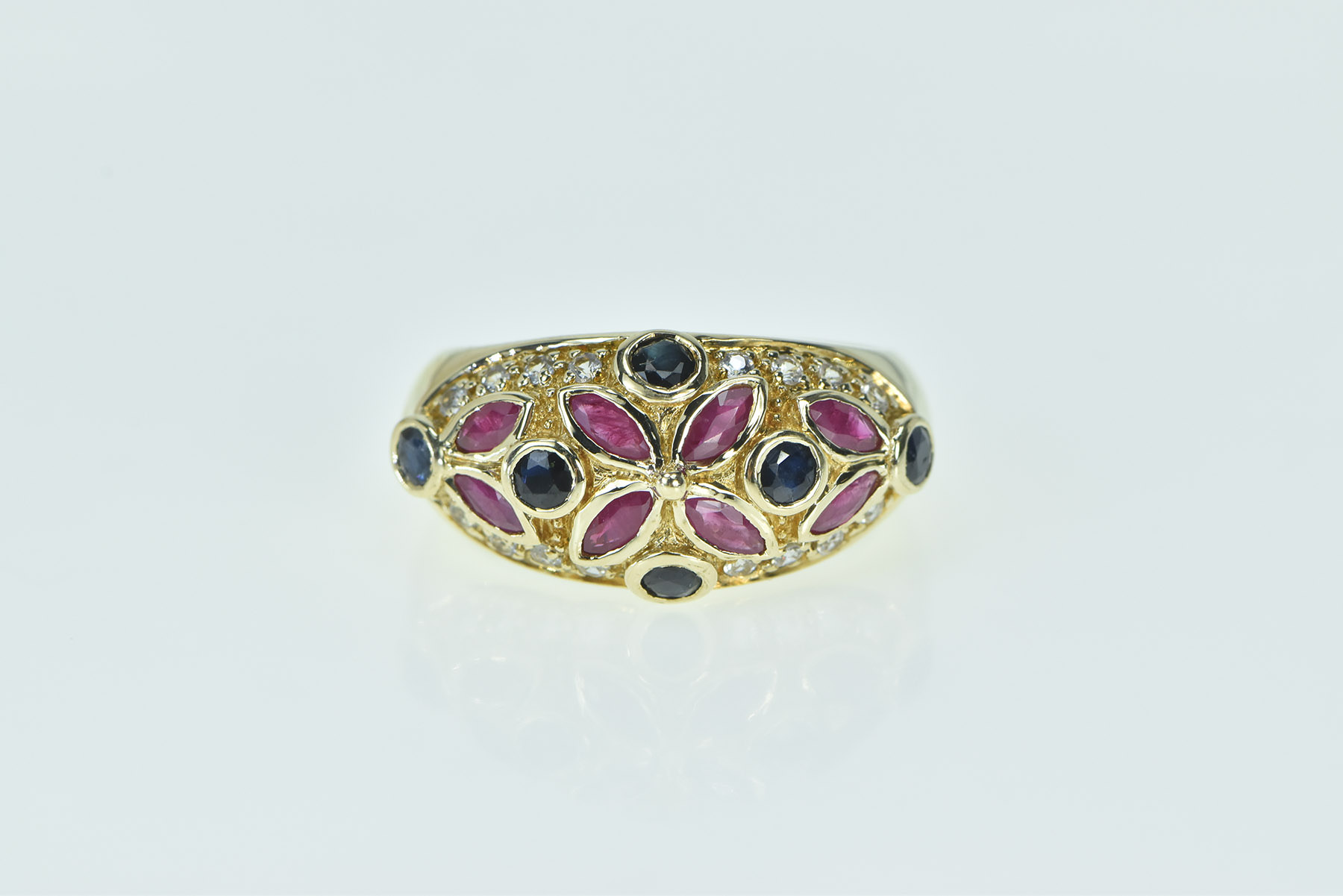 14K Ruby Flower Sapphire Diamond Statement Yellow Gold Ring, Size 7