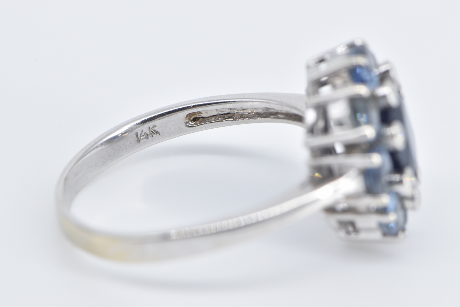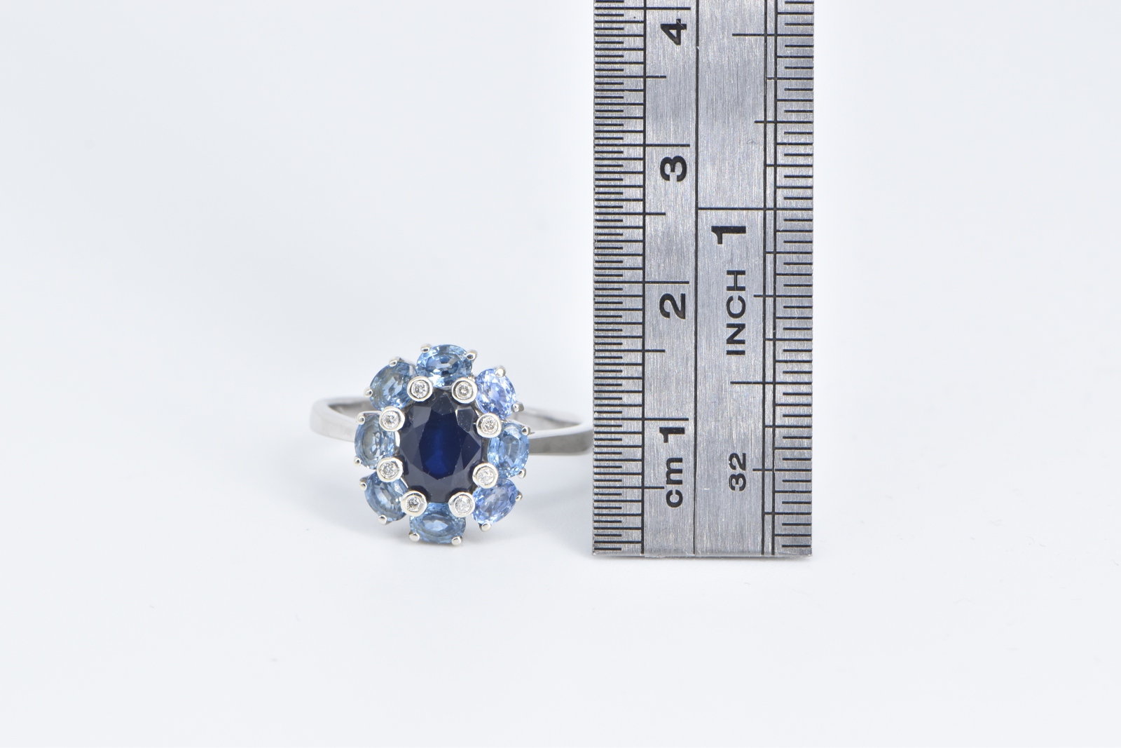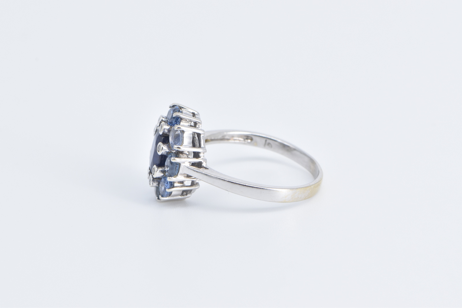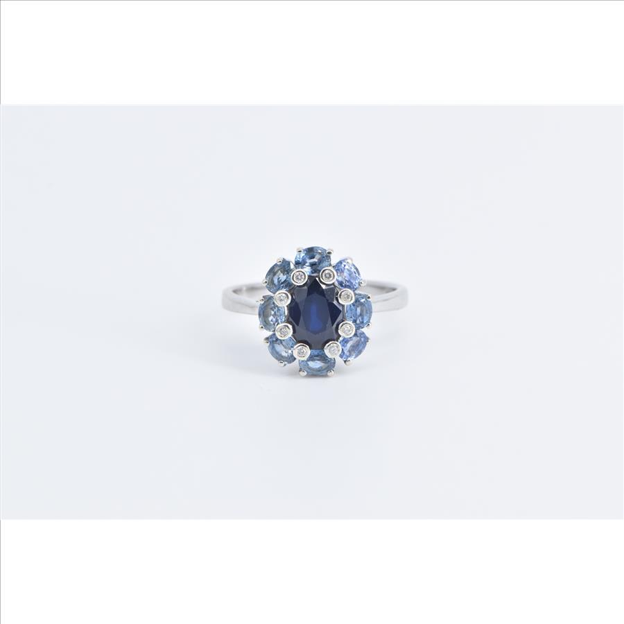 Item:  14K Sapphire Diamond Tanzanite Halo Statement White Gold Ring, Size 9