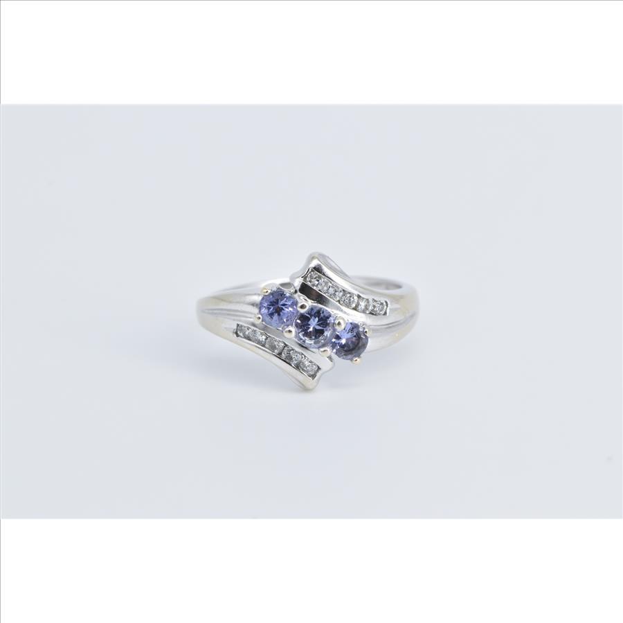 Item:  14K Three Stone Tanzanite Diamond Vintage Bypass White Gold Ring, Size 7.25