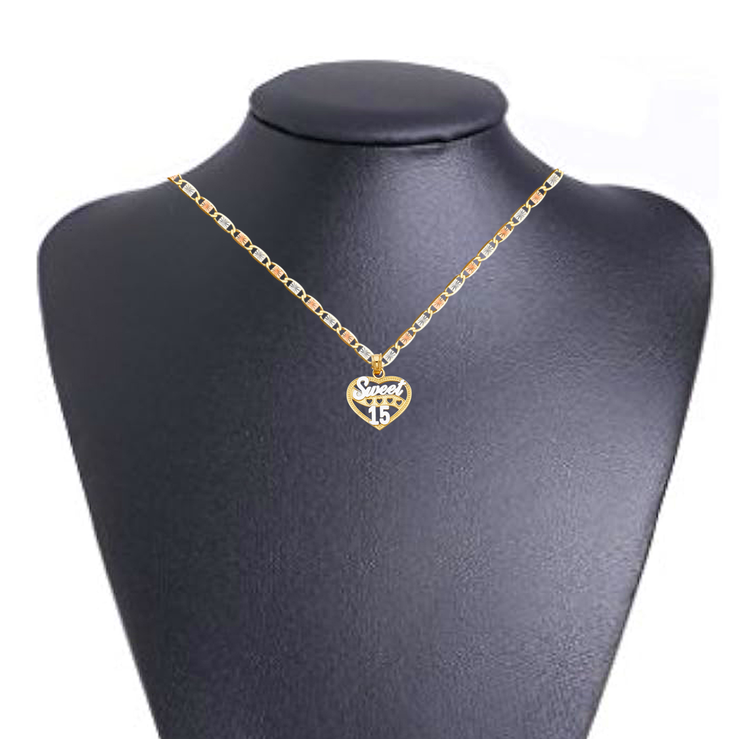 14K Two Tone Gold 15 Years Heart Pendant with 14K Tri Color Gold 1.5mm Valentono Chain -18 Inch