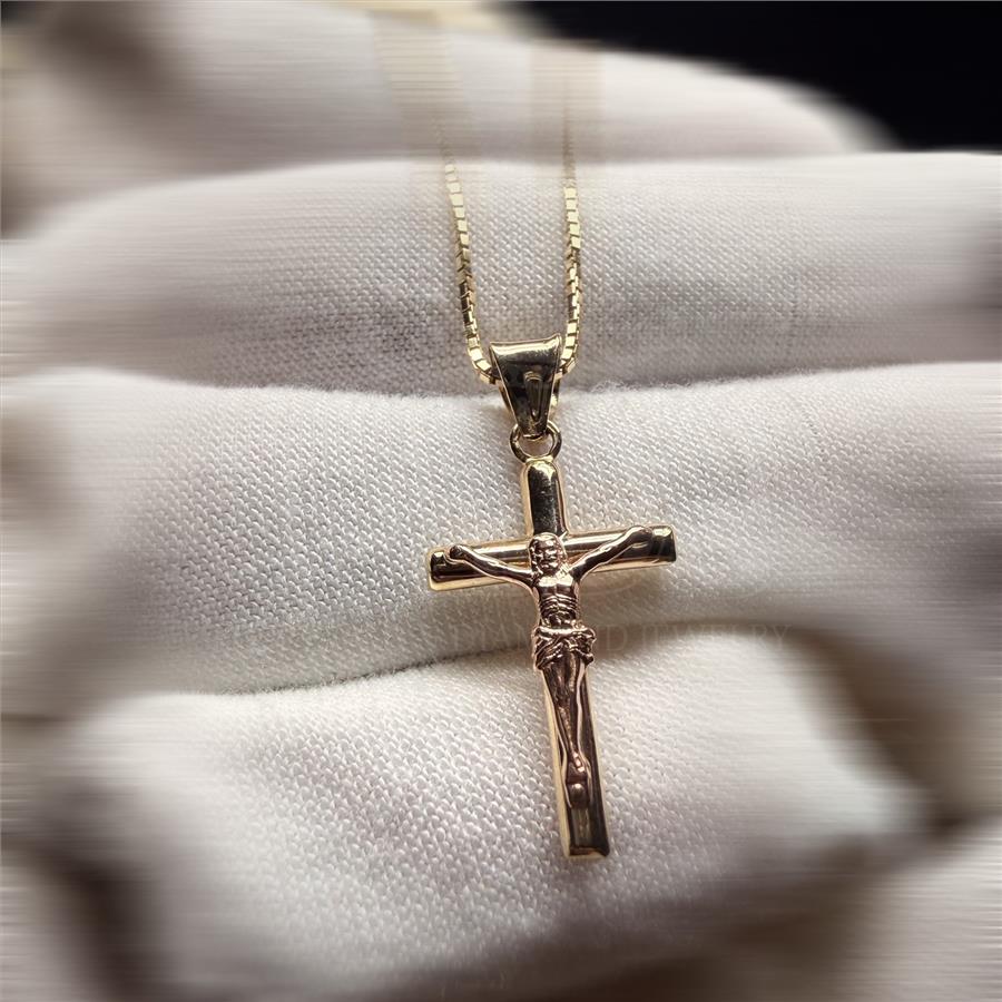 14K Two Tone Gold Crucufix Pendant With Yellow Gold 0.8mm Box Chain - 18 Inch
