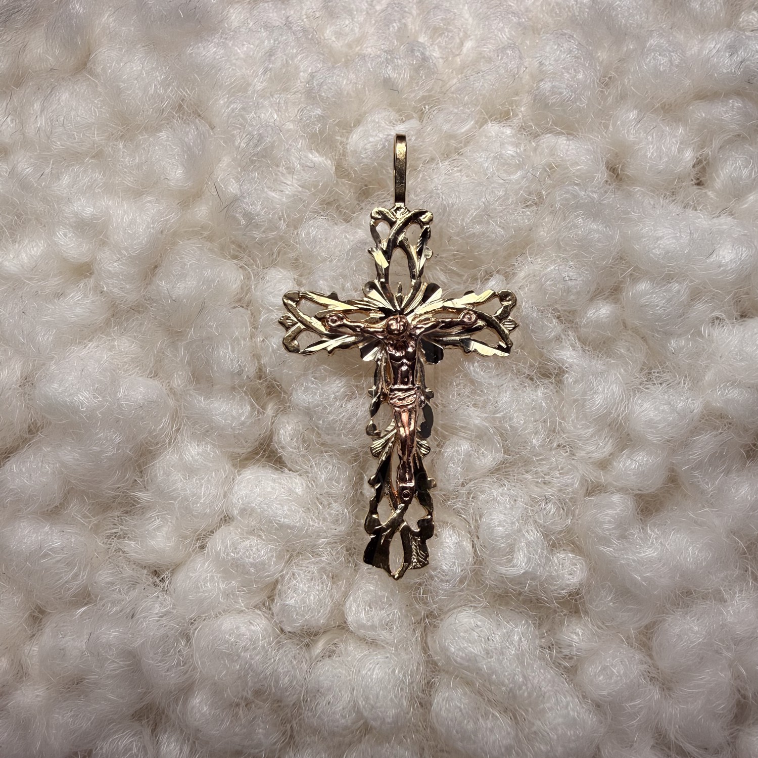 14K Two Tone Gold Fancy Crucufix Pendant With Yellow Gold 2.7mm Cuban Chain - 20 Inch