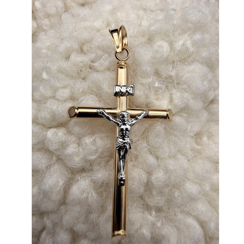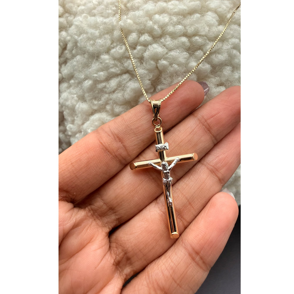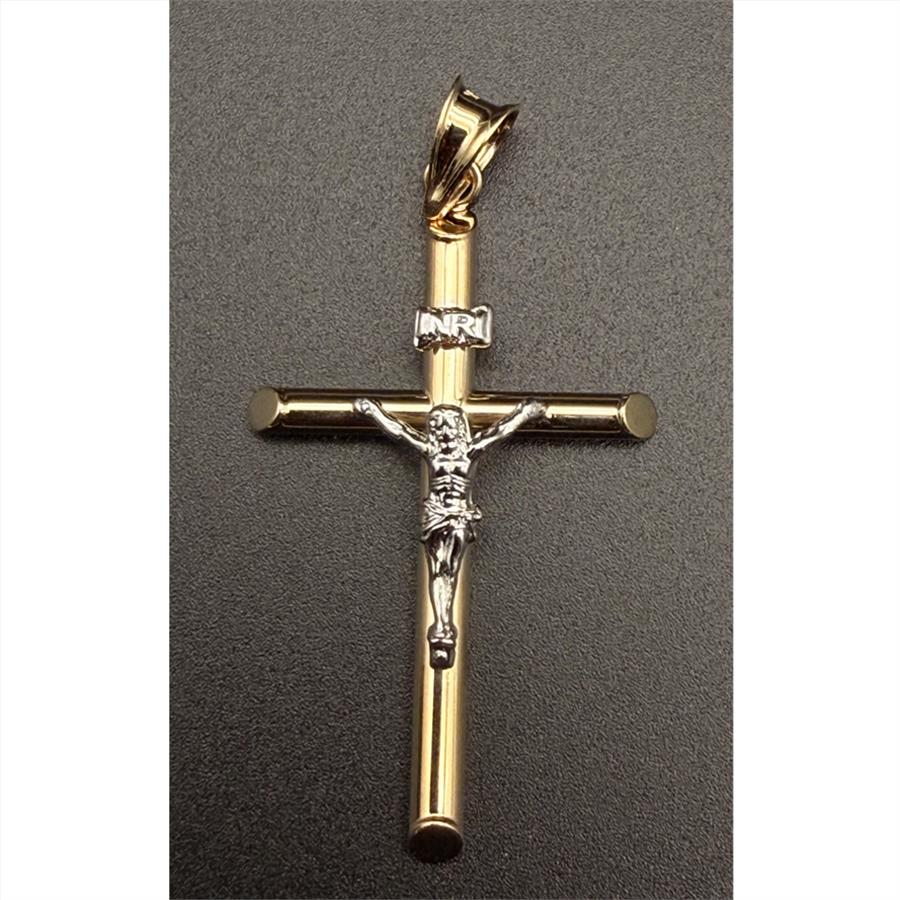 14K Two Tone Gold Hollow Round Tube Crucufix Pendant