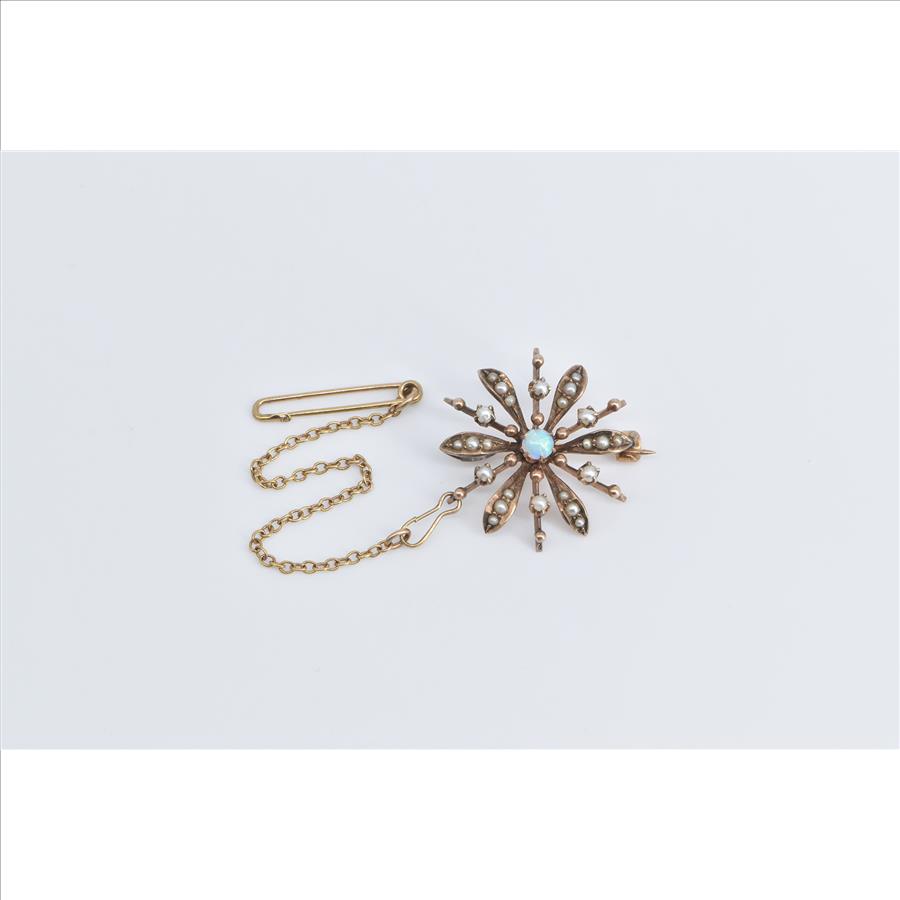 Item:  14K Victorian Ornate Opal Seed Pearl Flower Chain Yellow Gold Pin/Brooch