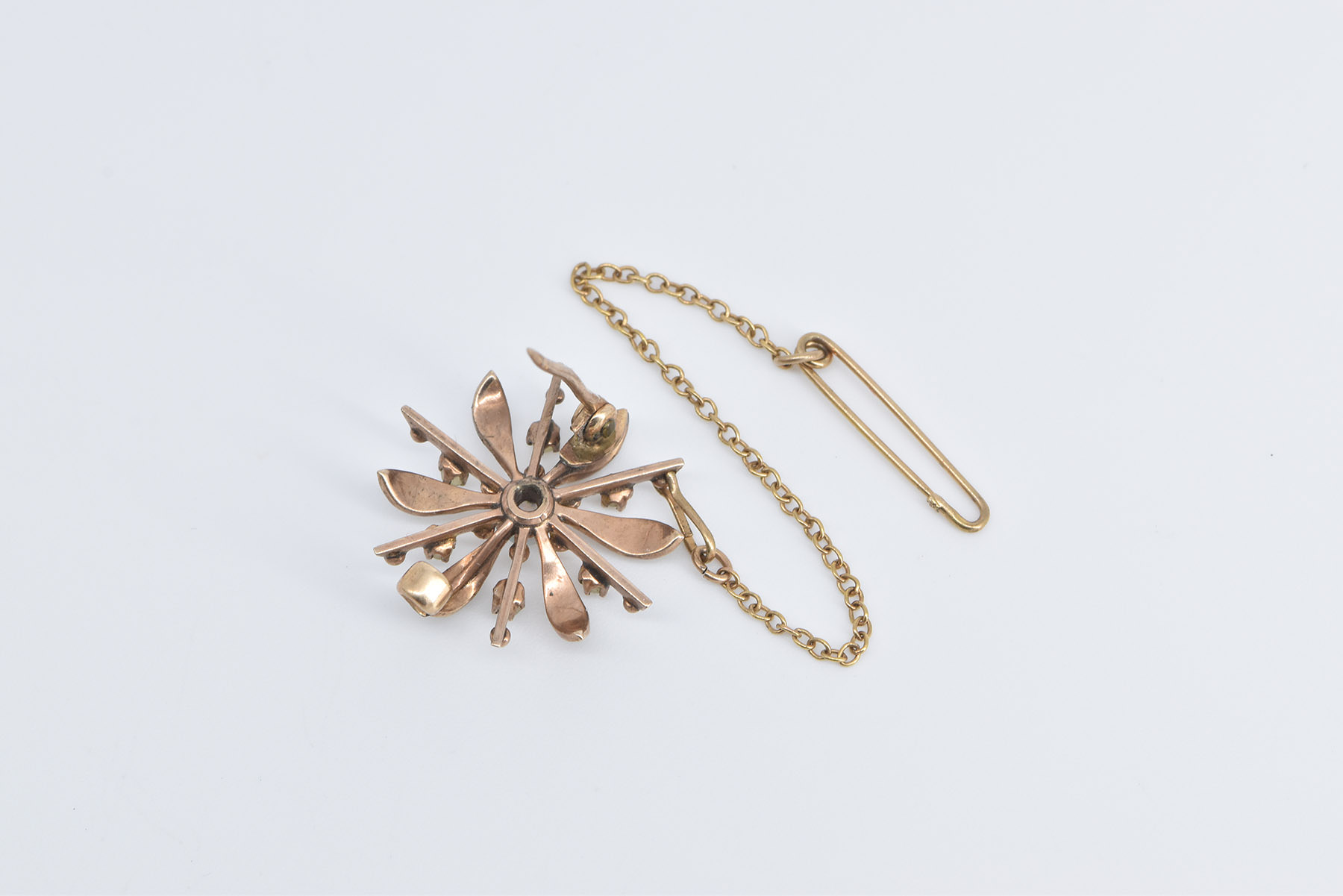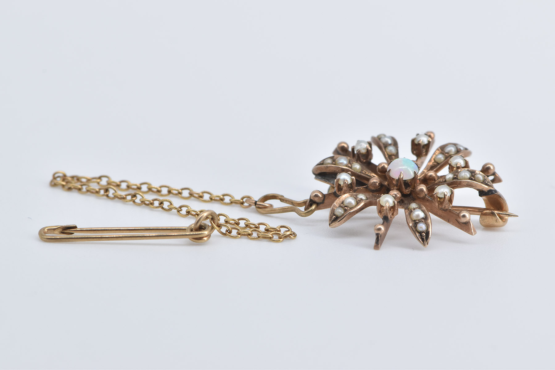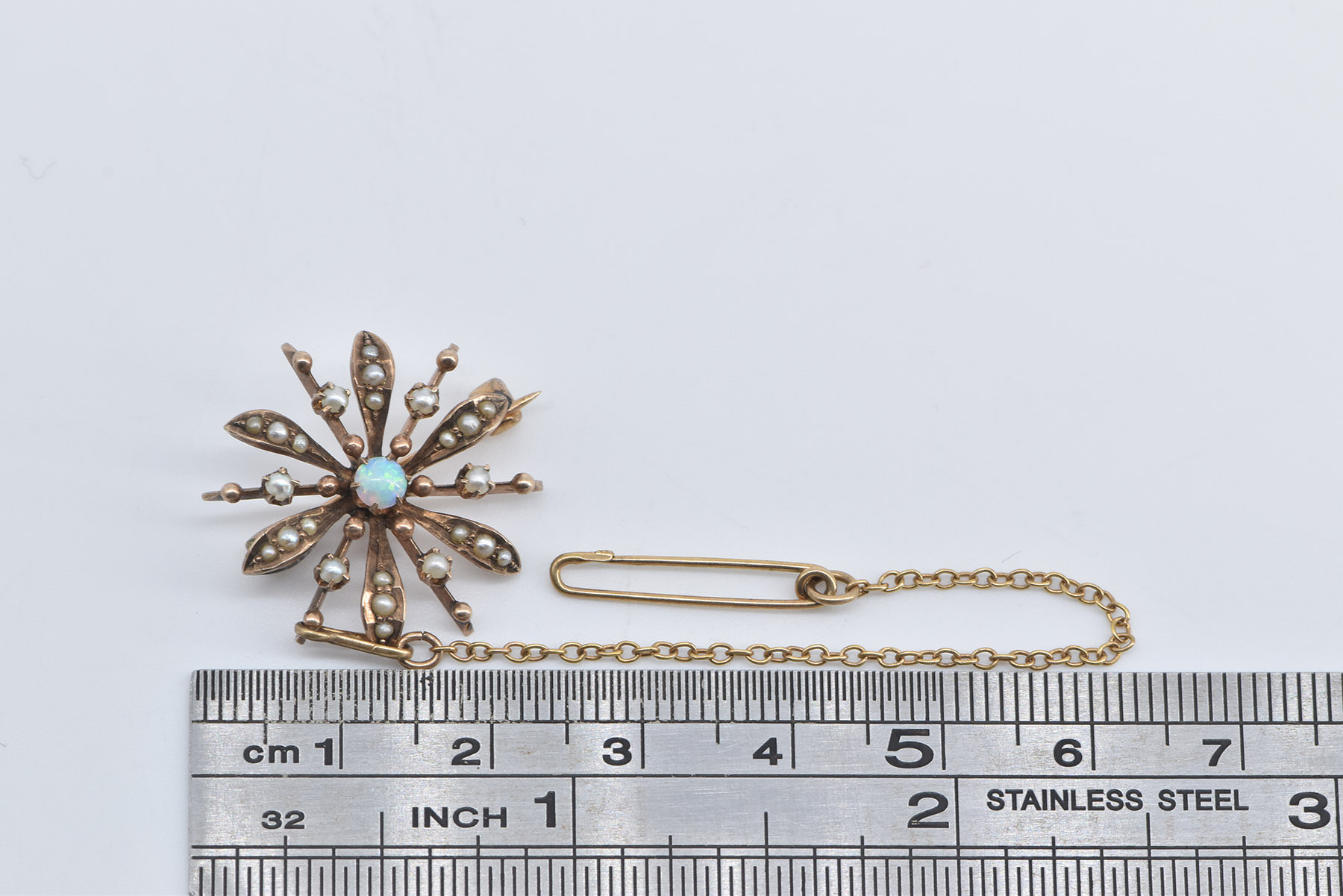 14K Victorian Ornate Opal Seed Pearl Flower Chain Yellow Gold Pin/Brooch