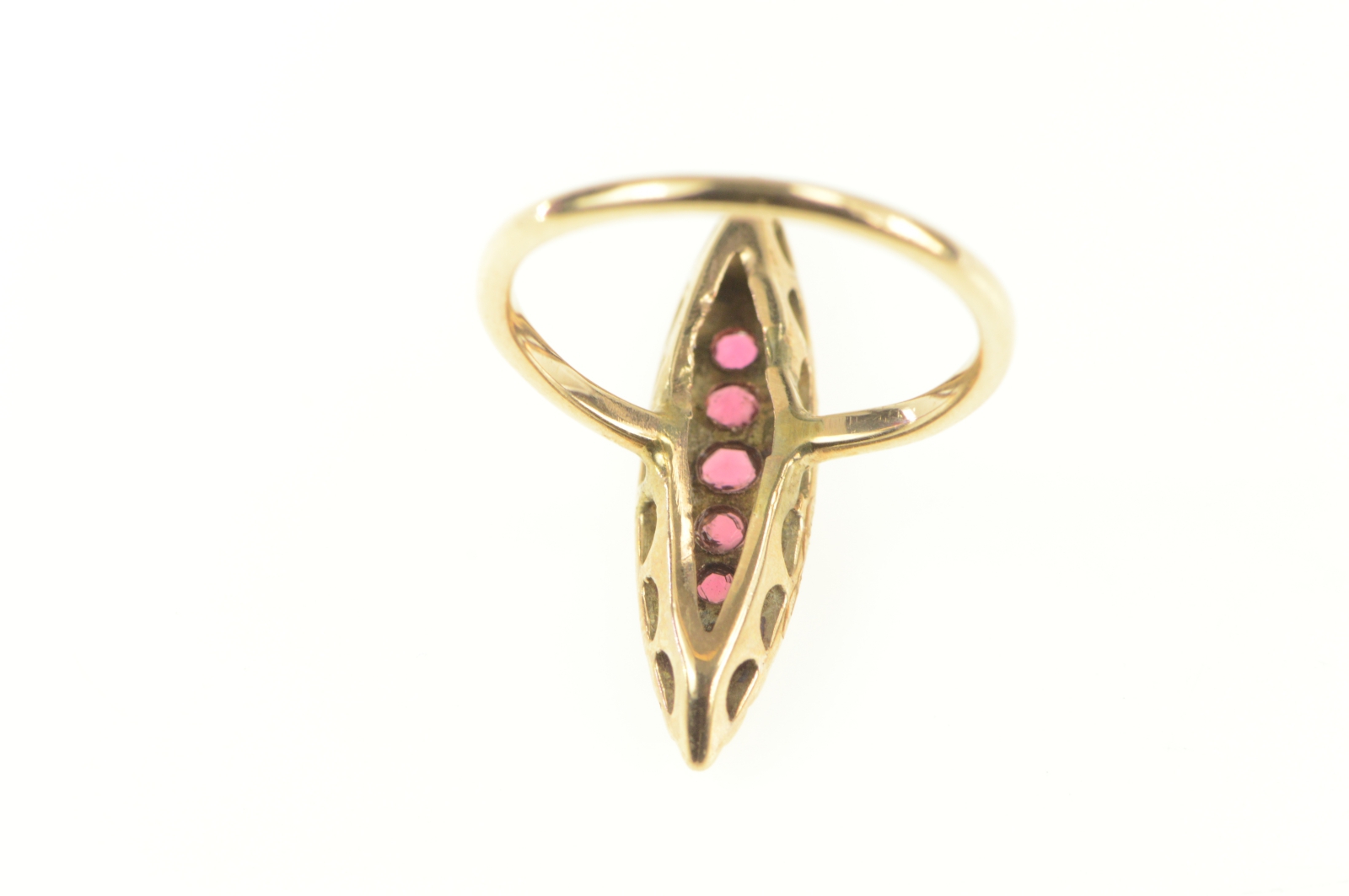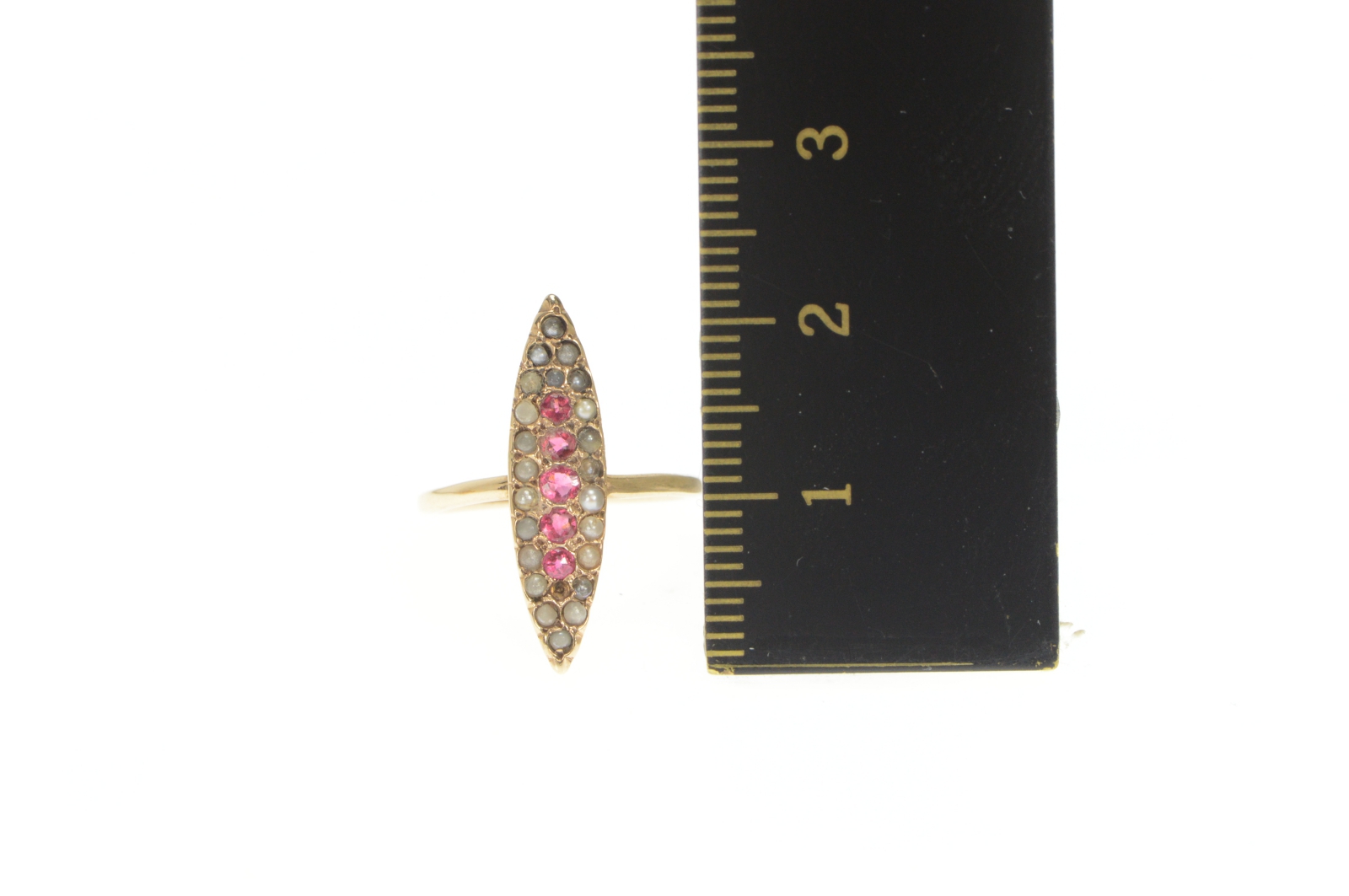 Item:  14K Victorian Ruby Seed Pearl Navette Yellow Gold Ring, Size 3.5