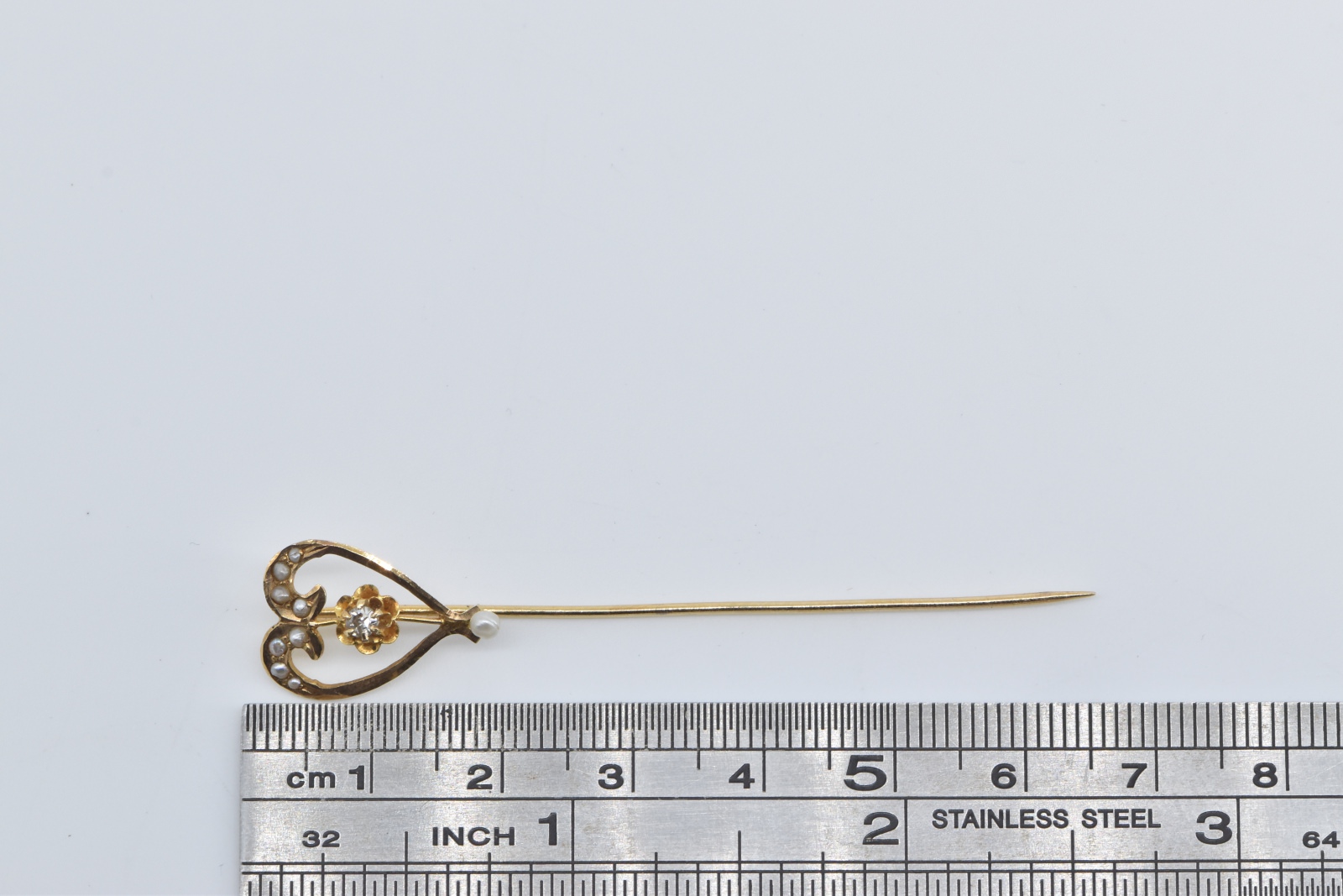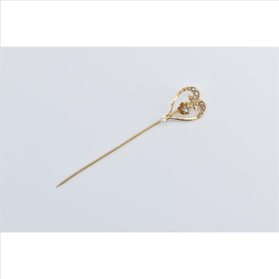 Item:  14K Victorian Seed Pearl Diamond Heart Ornate Yellow Gold Stick Pin