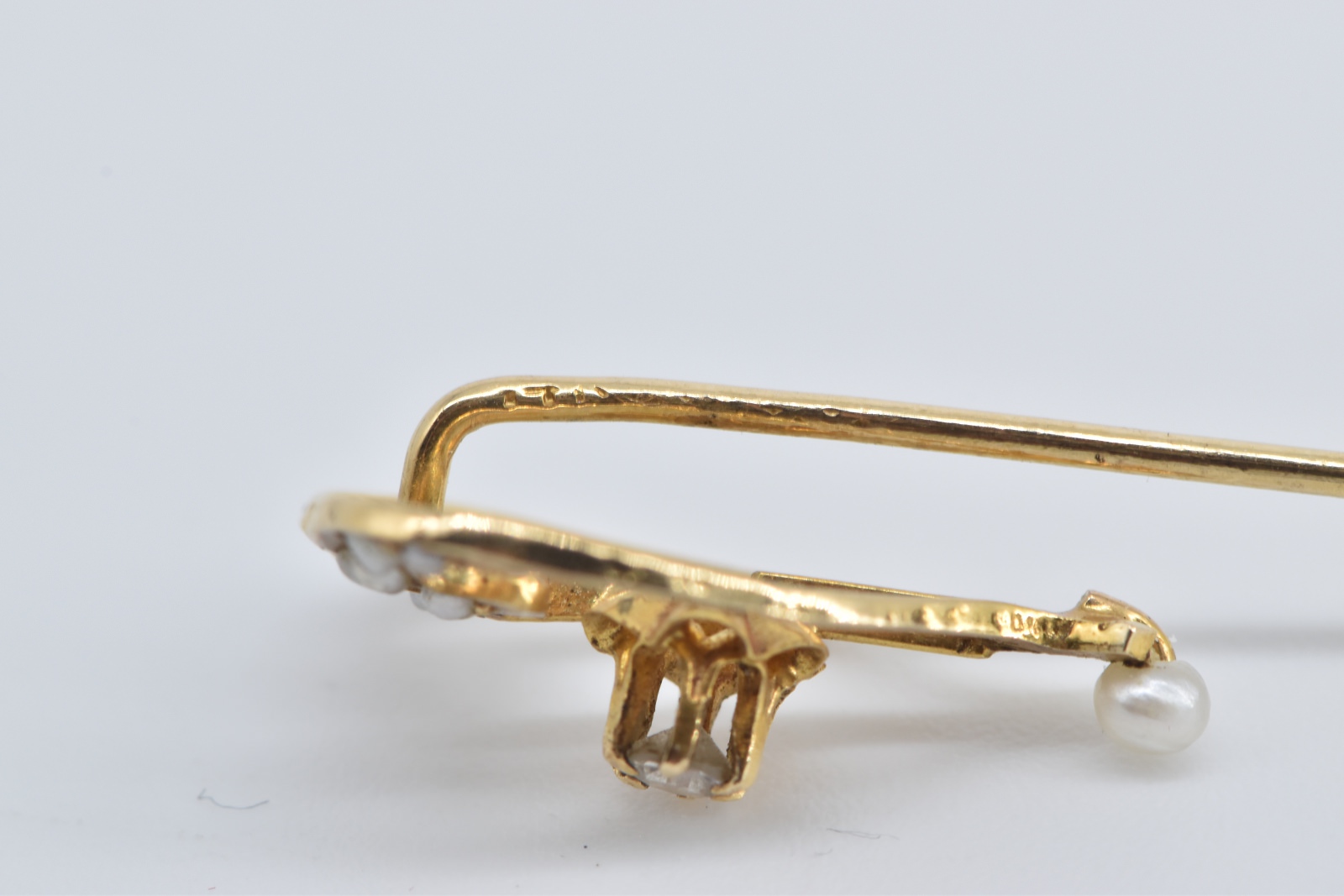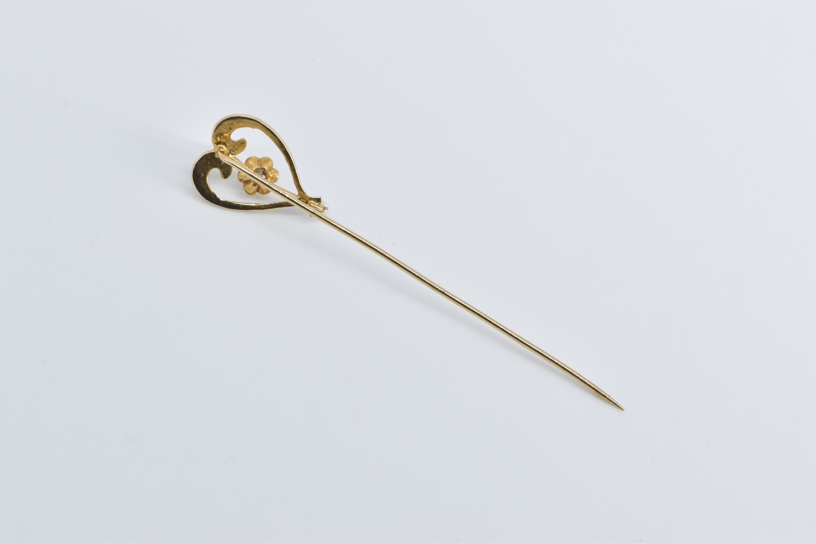 14K Victorian Seed Pearl Diamond Heart Ornate Yellow Gold Stick Pin