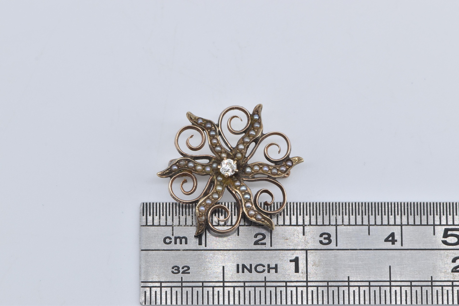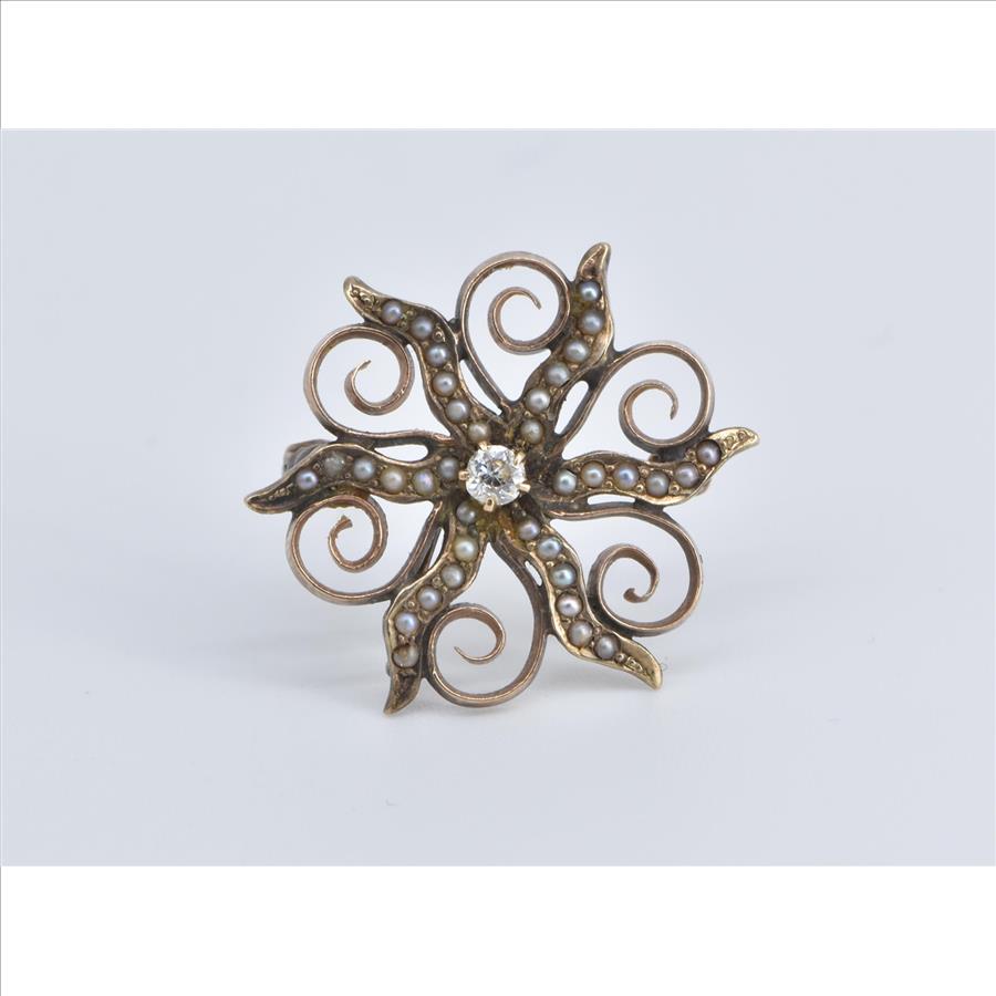 Item:  14K Victorian Seed Pearl Diamond Sun Flower Rose Gold Pin/Brooch