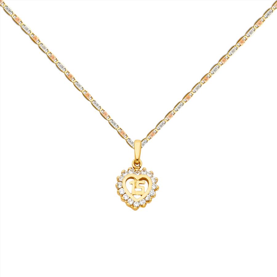 14K Yellow Gold 15 Years Heart Pendant with 14K Tri Color Gold 1.5mm Valentono Chain -18 Inch