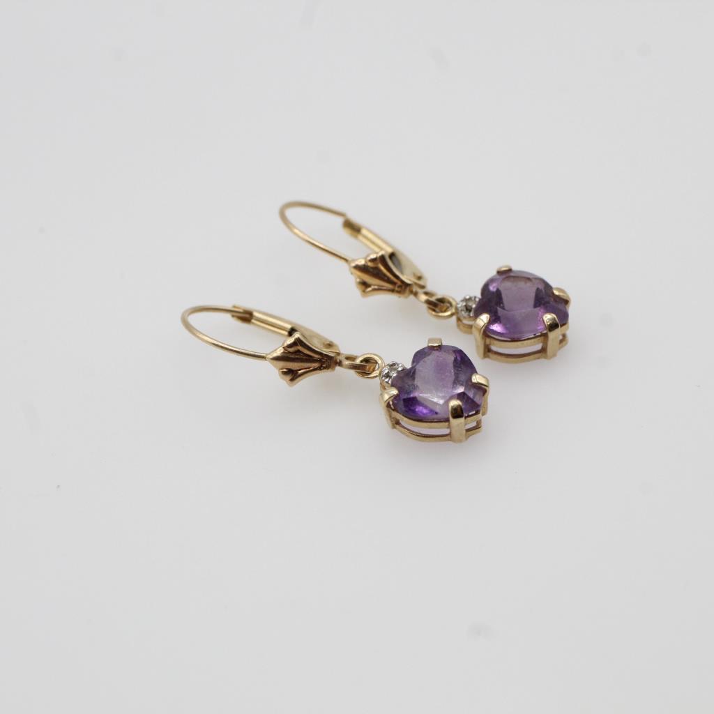 14kt Gold Diamond Purple Heart Dangle Earrings