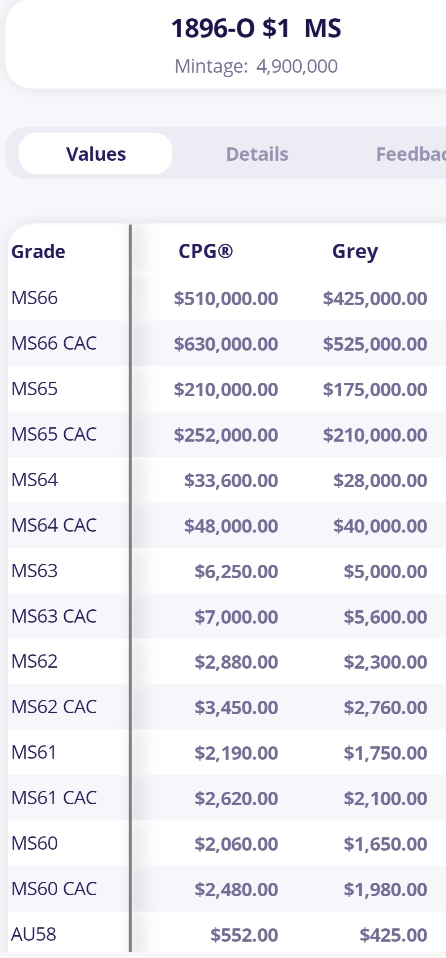 1896-O Morgan Dollar $1 - SEGS AU58 Details - Greysheet (Wholesale Price) is $425.00 - Reserve is 56% lower than that price!
