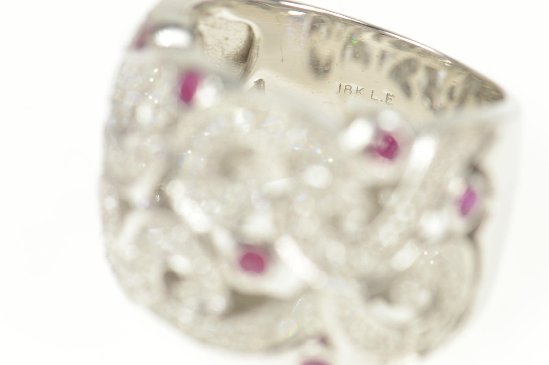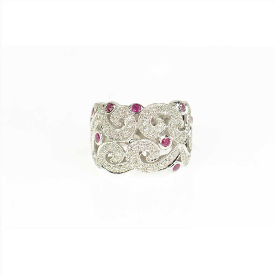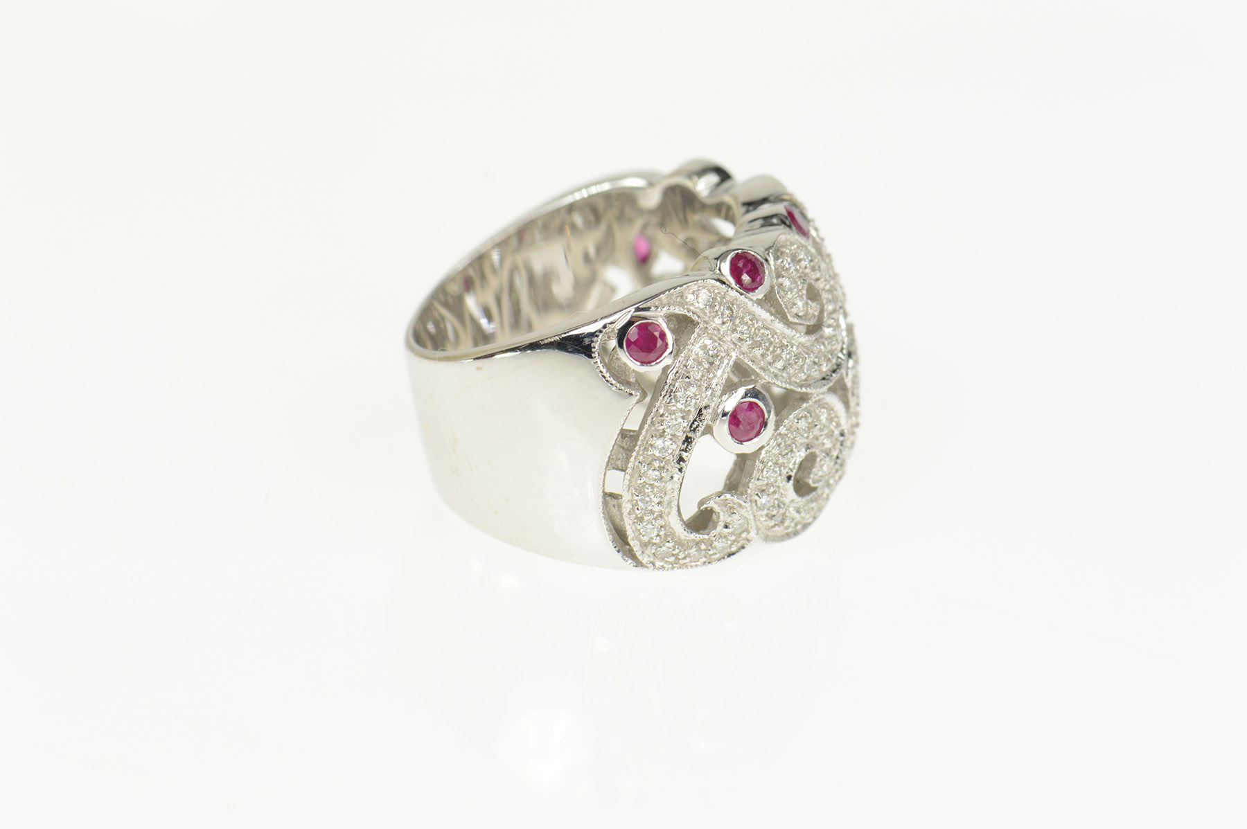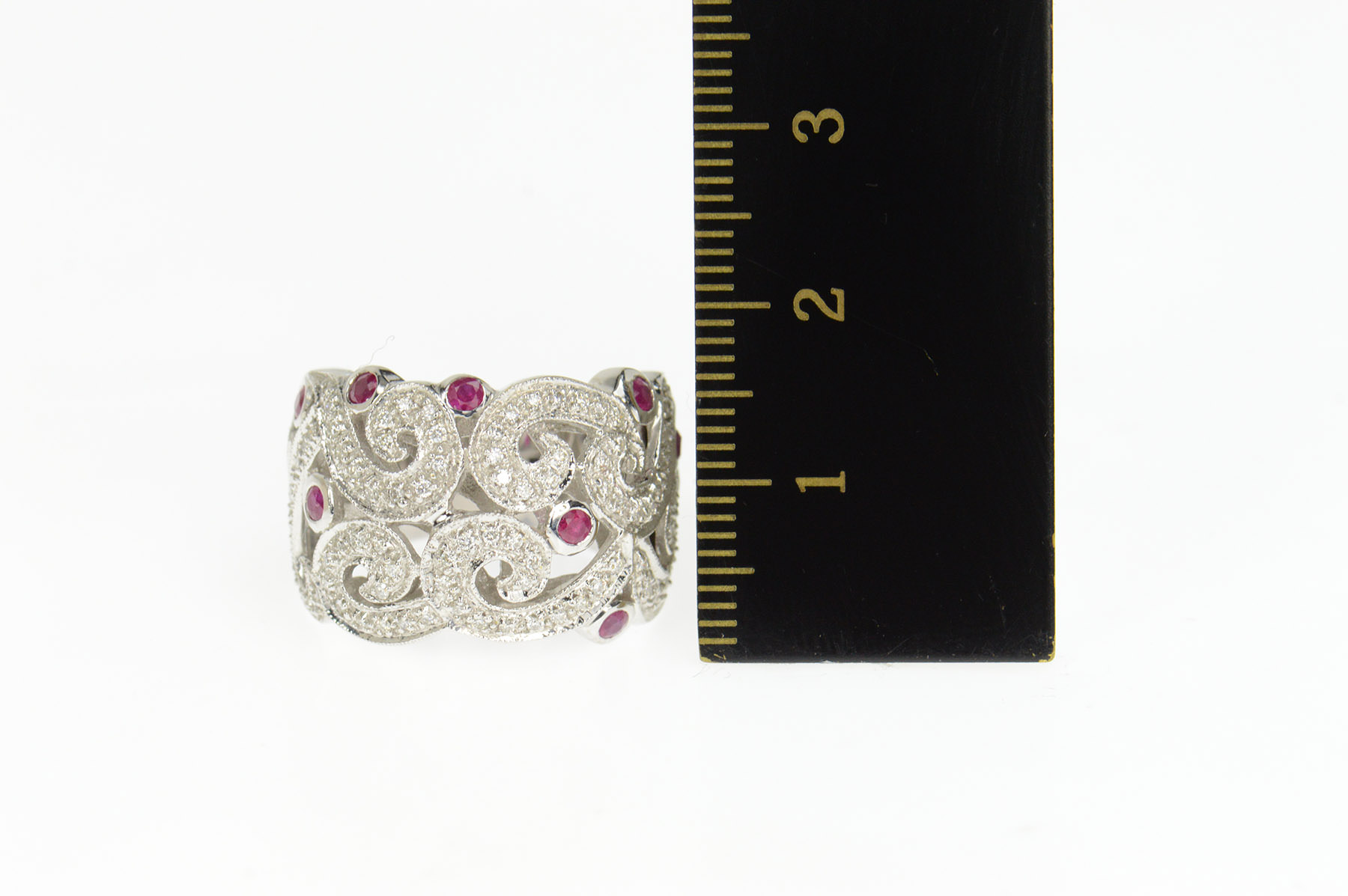 Item:  18K 1.07 Ctw Ruby Diamond Ornate Swirl Statement White Gold Ring, Size 6