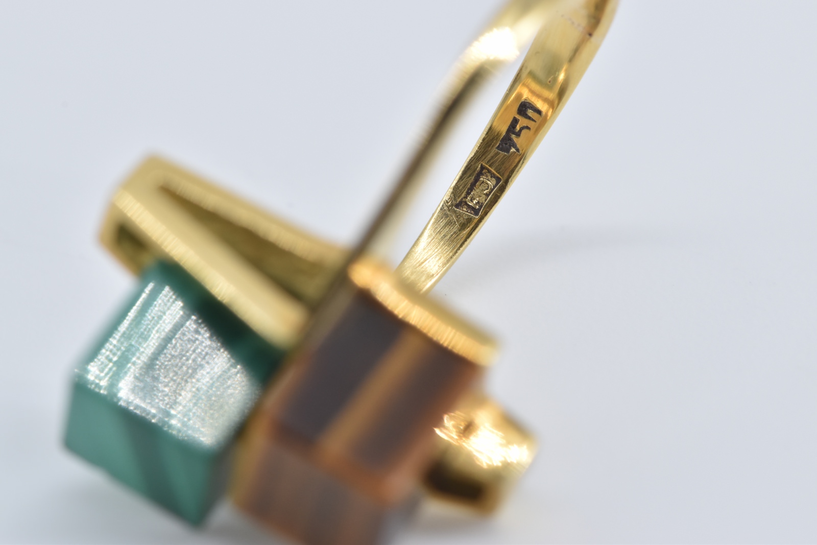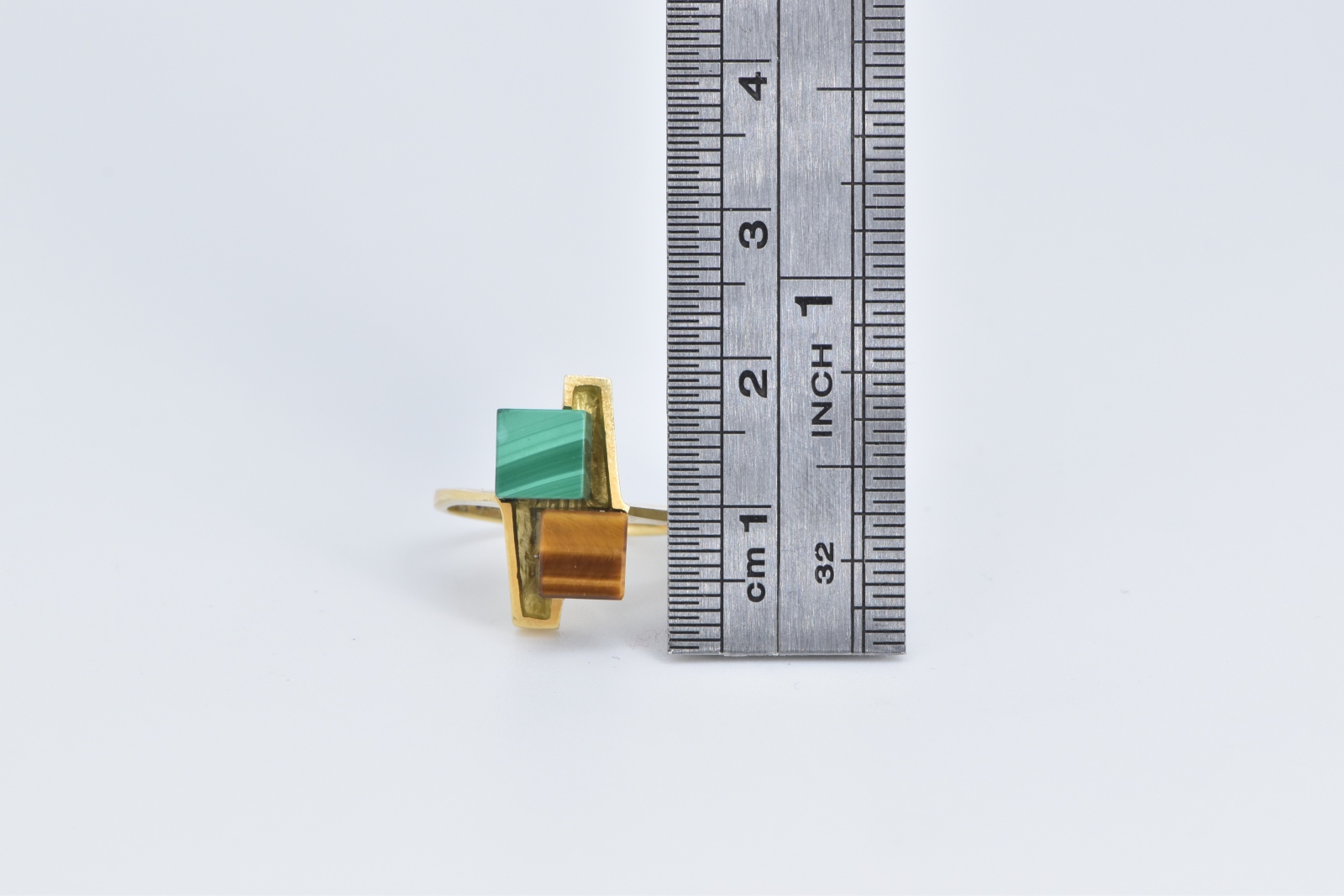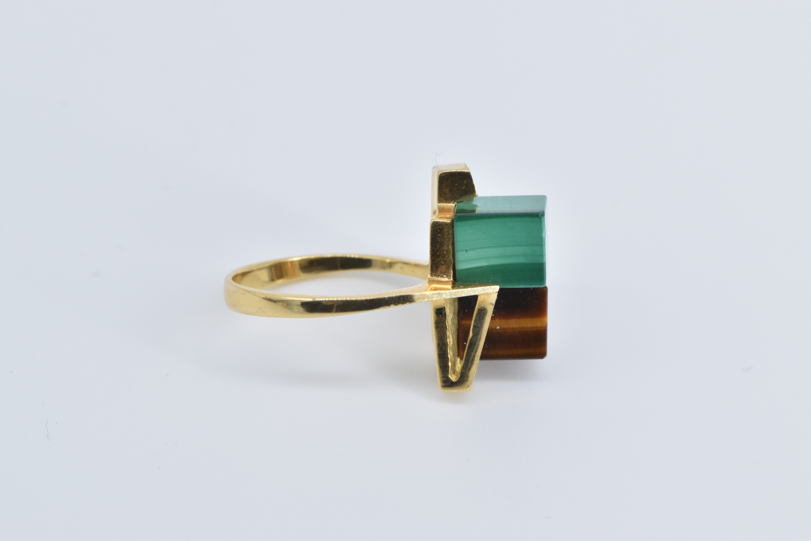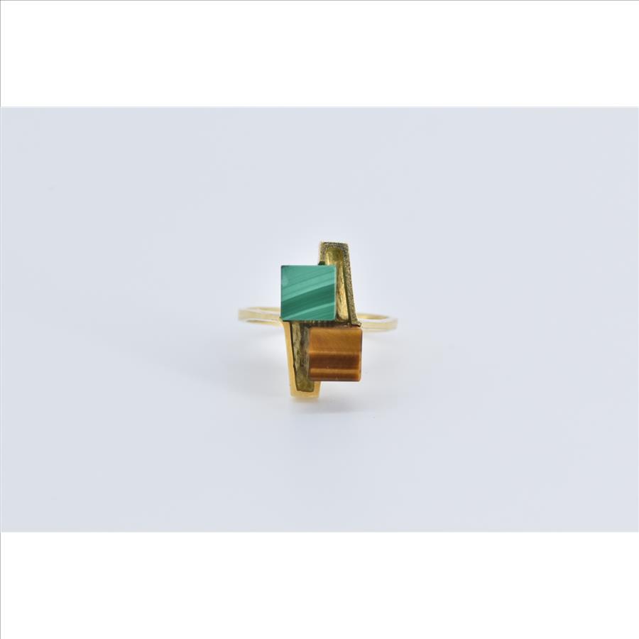Item:  18K 1960's Malachite Tiger's Eye Cube Geometric Yellow Gold Ring, Size 4.5